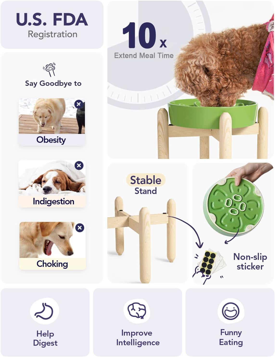 LE TAUCI Ceramic Slow Feeder Dog Bowls Elevated for Small and Medium Breed, Dog Bowls with Wooden Stand, 1.5 Cups Pet Dishes to Slow Down Eating, Anti-Gulping Pet Feeding Dishes, Clover Green