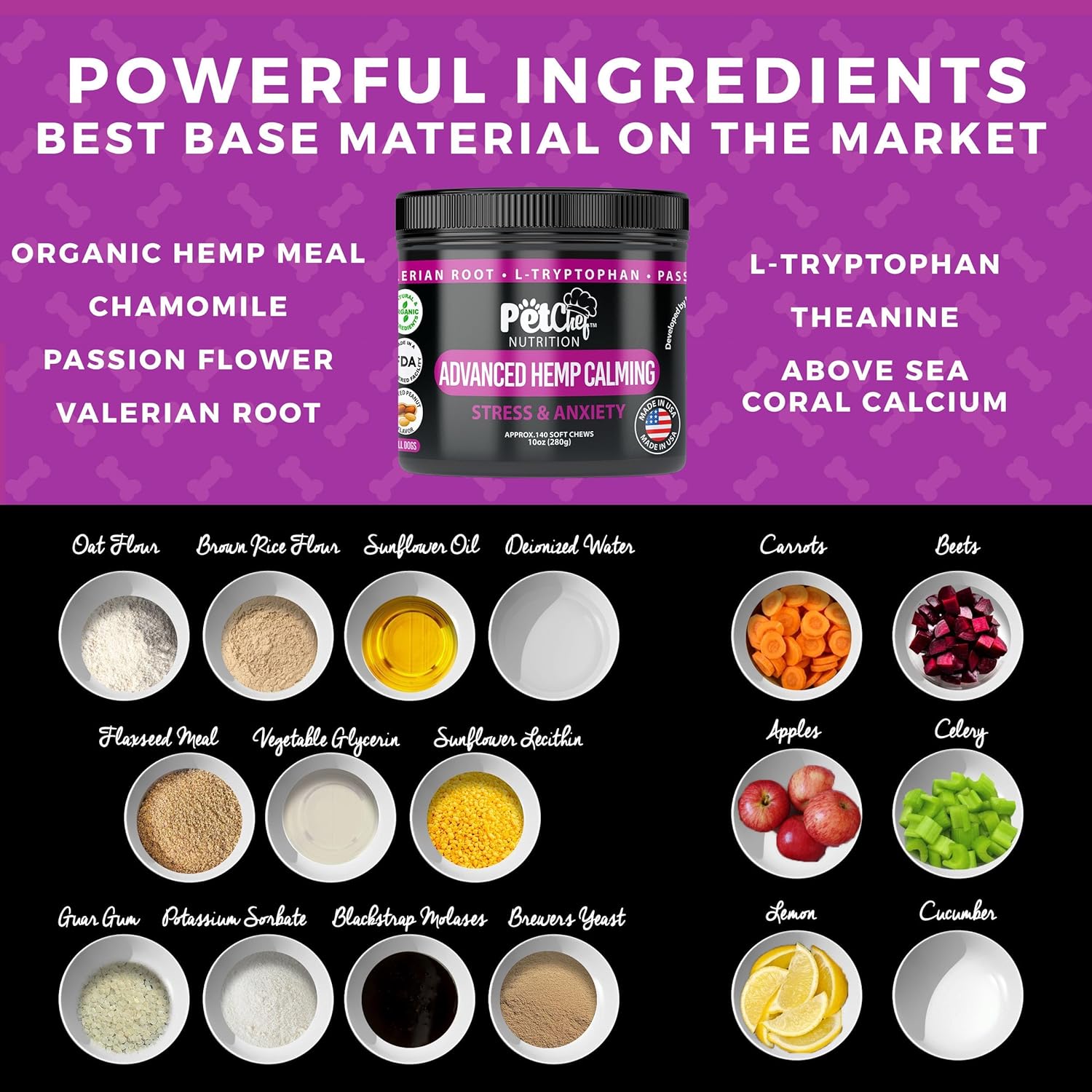 • Overcome Separation Anxiety - Soothe your dog's nerves during loud noises and separation anxiety. Our vet-recommended puppy calming chews are non-addictive, promoting a sense of calmness and reducing pacing or crying. Natural Calming Aid: dog calming chews - anxiety relief treats support help relieve your pet of any stress or anxiety using natural ingredients like passionflower, chamomile, hemp powder, hemp oil