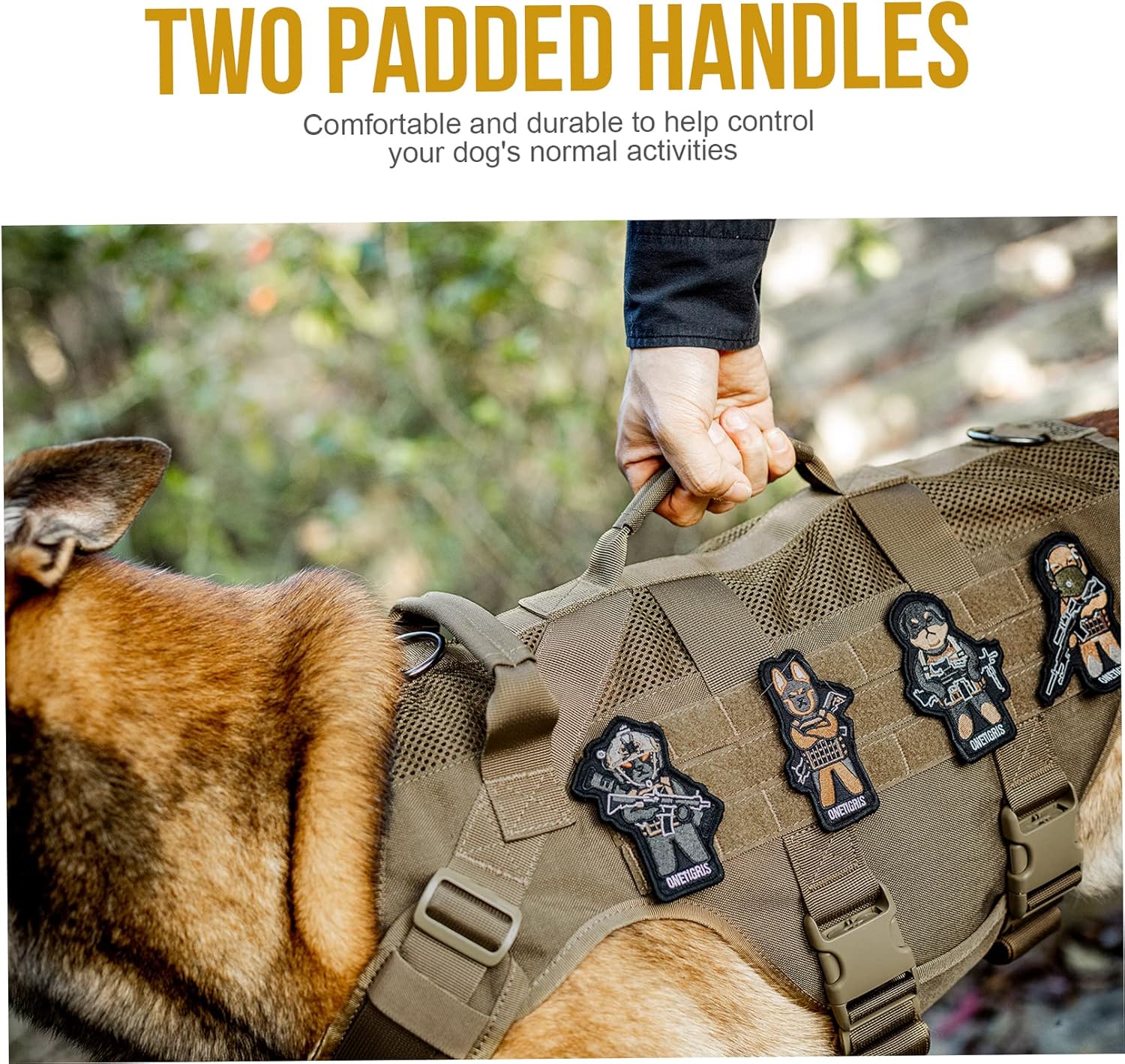 • [Molle/Handles]: Looped MOLLE panel on both sides for MOLLE compatible add-ons such as treat totes, poop bag pouches, service dog kits, military patches and name tags. 2 padded grab handles with reinforced stitchin. Useful for getting in/out of a car, immediate canine control in crowded areas or with other dogs, etc.