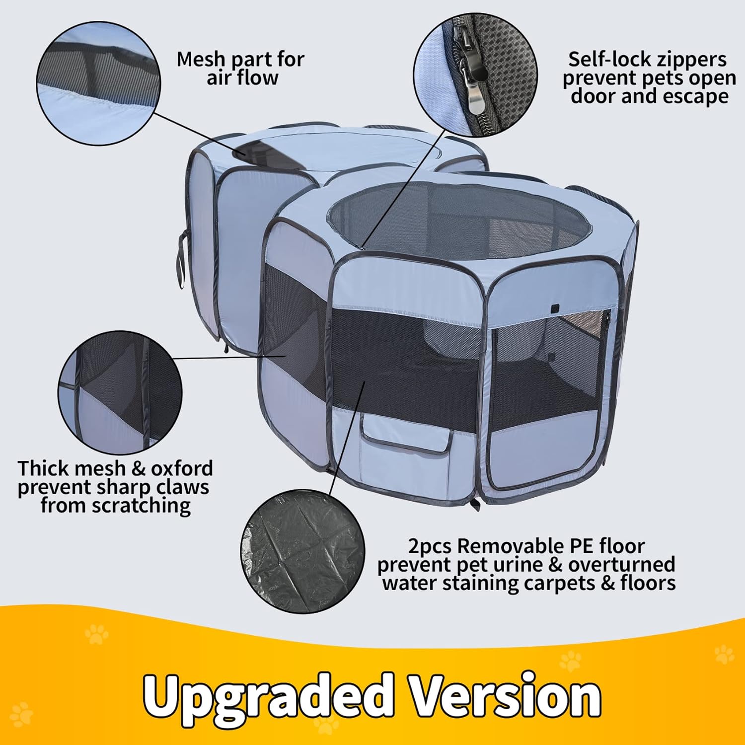 • 【Stable & Sturdy Construction】: Built with thicken metal frame, waterproof oxford cloth and reinforced stitching, ensuring long-lasting use, even with energetic pets. This playpen is designed to handle daily wear and tear while maintaining its shape.