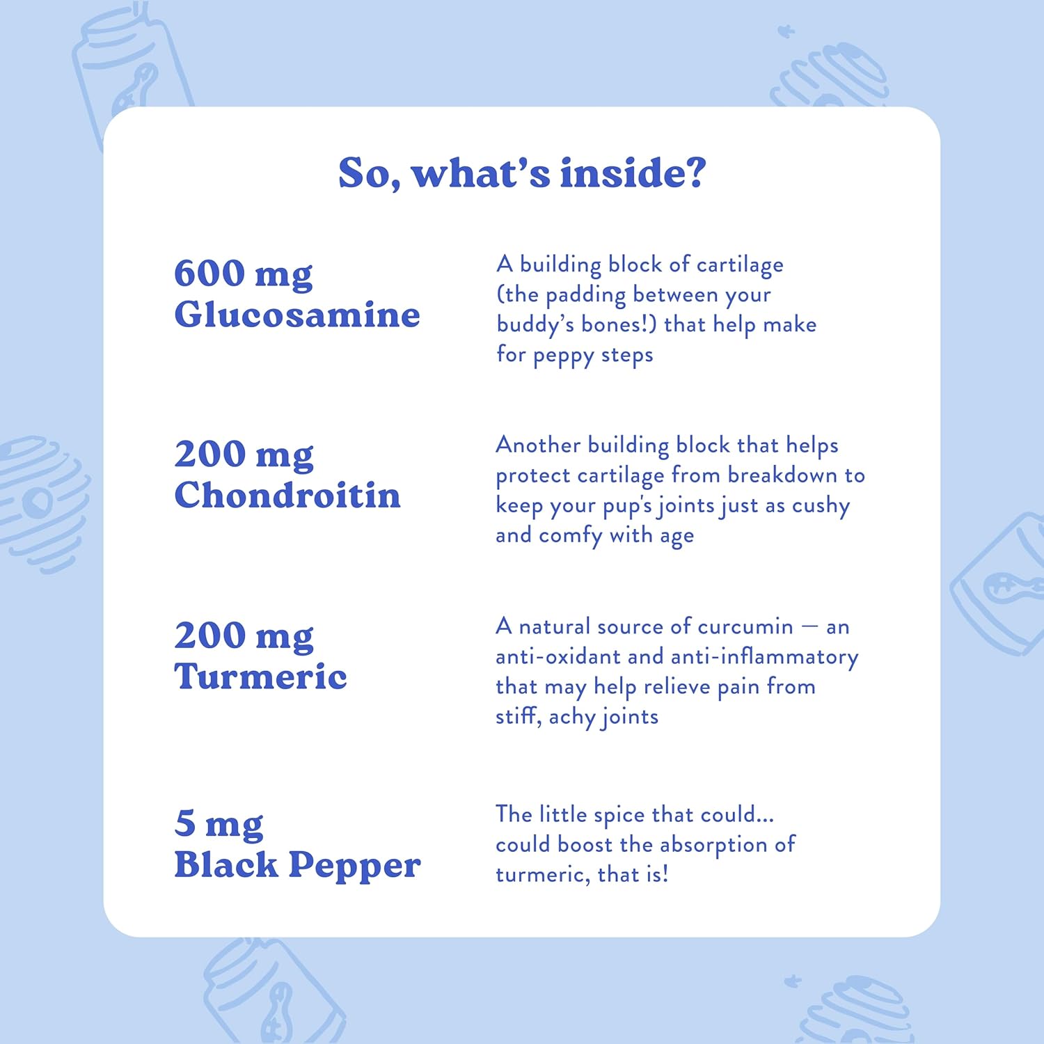 • Let’s keep the pep in your pup’s step! An advanced (... and extra tasty!) formula to help your dog move more comfortably and confidently – without the artificial flavors.