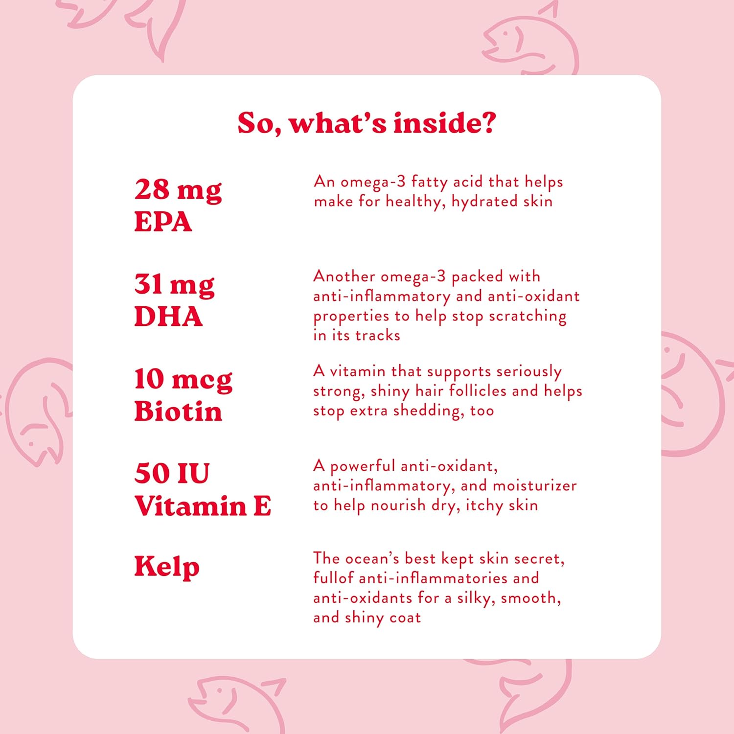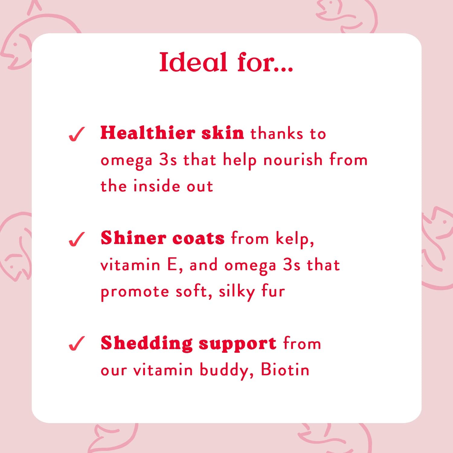 • Let’s help give your dog’s coat a healthy (and extra shiny!) boost. A daily nutritional supplement to support healthy skin and a silky coat. Our formula (with tasty, USA salmon!) includes vitamin E and essential fatty acids, too.