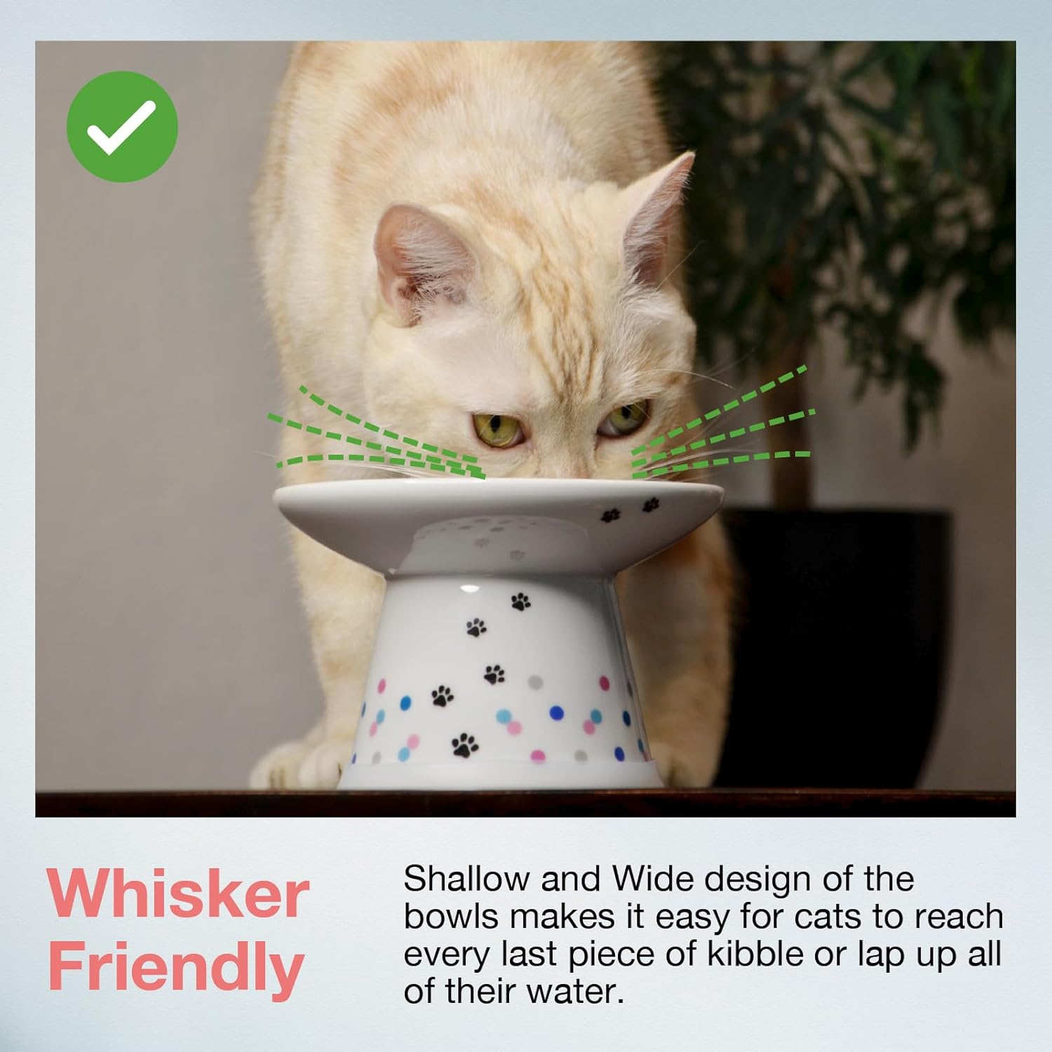 • Design & Comfort: This extra wide elevated cat food bowl (colorful dots limited edition) helps reduce whisker fatigue and strain on your cat’s neck; ideal for flat-faced breeds and messy eaters, serving as whisker fatigue cat bowl which keeps food centered.