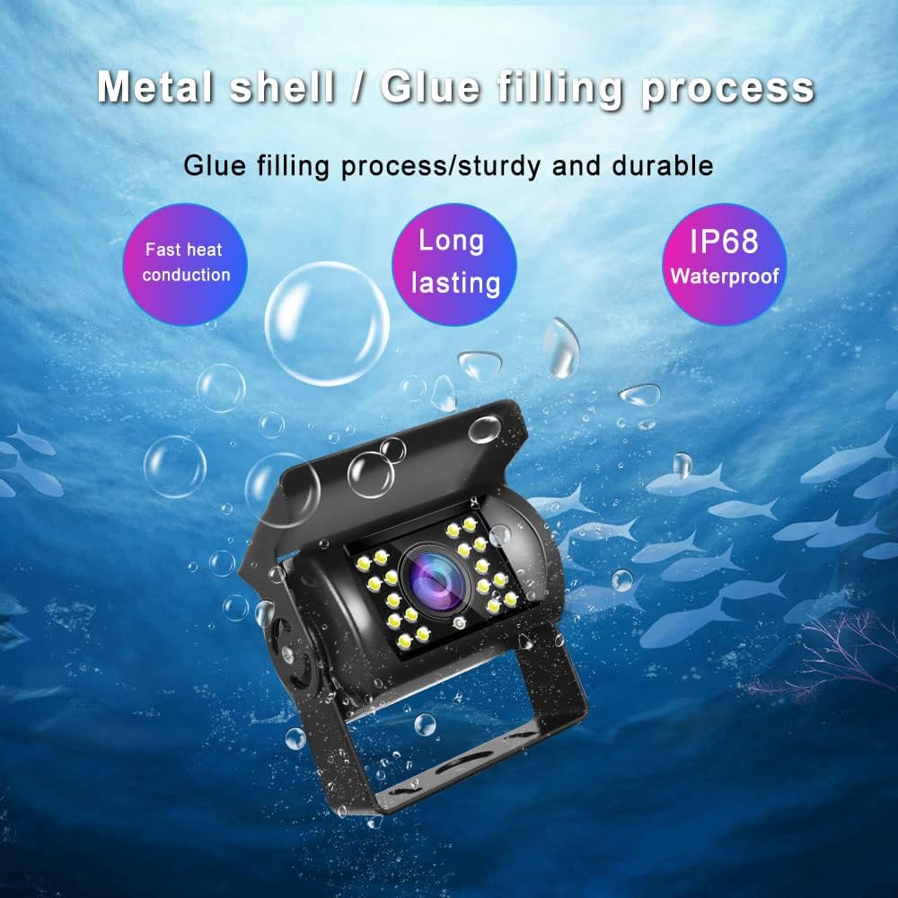 • 【IP68 Waterproof Reverse Camera (No Guide Lines)】Hard Metal Cased Camera, waterproof and Mud proof. 18 IR LEDs for Night Vision + 120° horizontal wide view angle + 180°vertical adjustable angle to view the blind spots. You can get it work Full Time when connect to constant power source