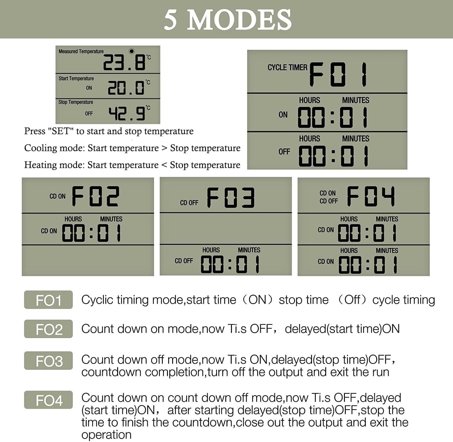 • MODE SELECTION : 5 modes to choose from, F01 cycle timing control mode, F02 countdown on mode, F03 countdown off mode, and F04 timing switching mode. Timing range: 0-99 hours 59 minutes. Timing accuracy: Up to 10 minutes.