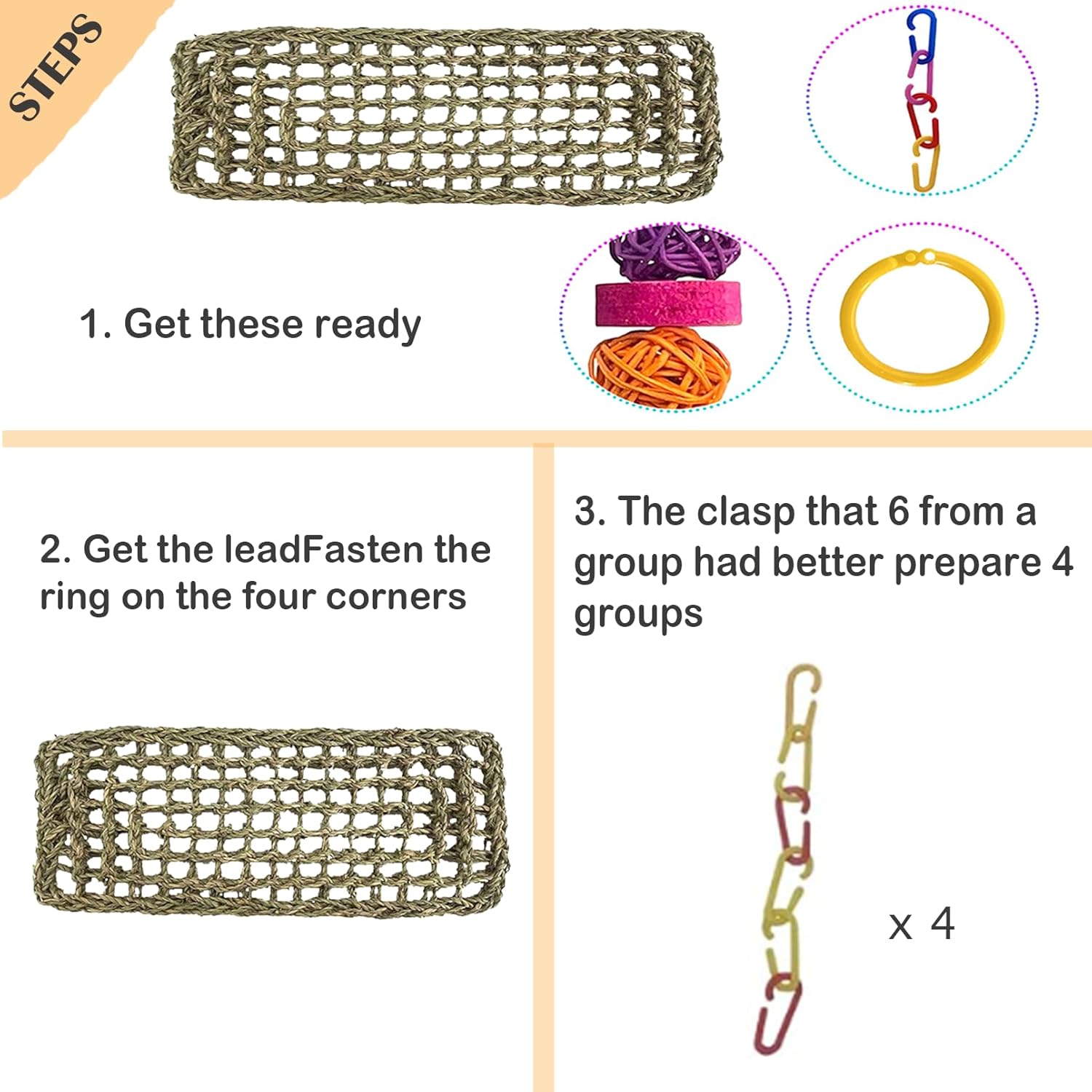 • 【PRODUCT FEATURES】Birds can not only rest on the seagrass mat for birds, but also swing on bird hammock for conures.There are little bells on the chains, and When the parrot pecked the bird seagrass swing, they make a pleasant sound.While avoiding their boredom, Bird seagrass mat also provides a comfortable and safe place.