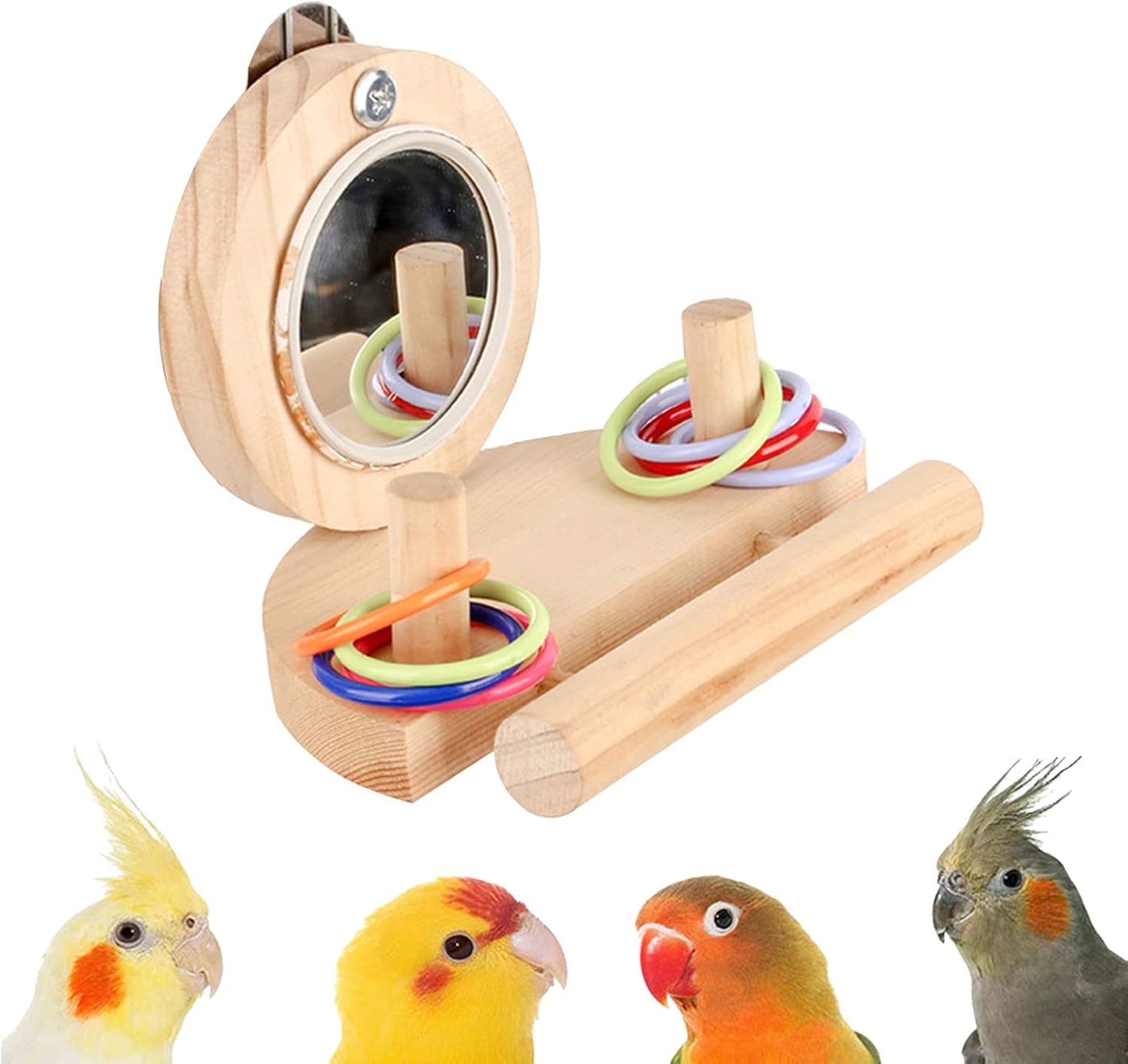 Parrot Mirror Toy for Cage, Pet Mirror Toys Set with Wooden Platform Stand Perch, 8 Pcs Colorful Stacking Rings Bird Toy Intelligence Toys, Idea for Cockatiel Parrot Bird Cage Health Supplies