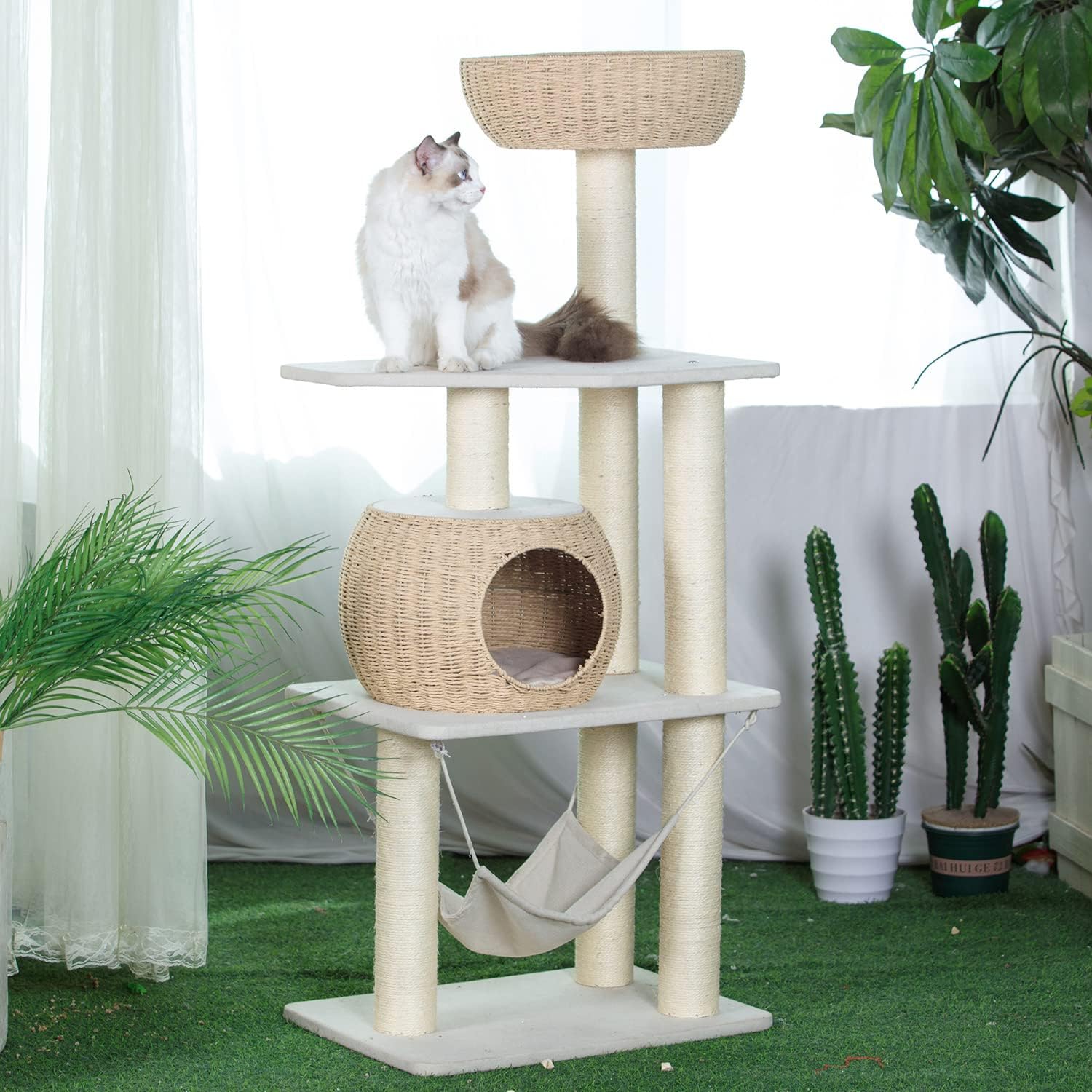 Wood Cat Tree for Indoor Cats, 52.4 Inch Tall, with Scratching Post and Hammock