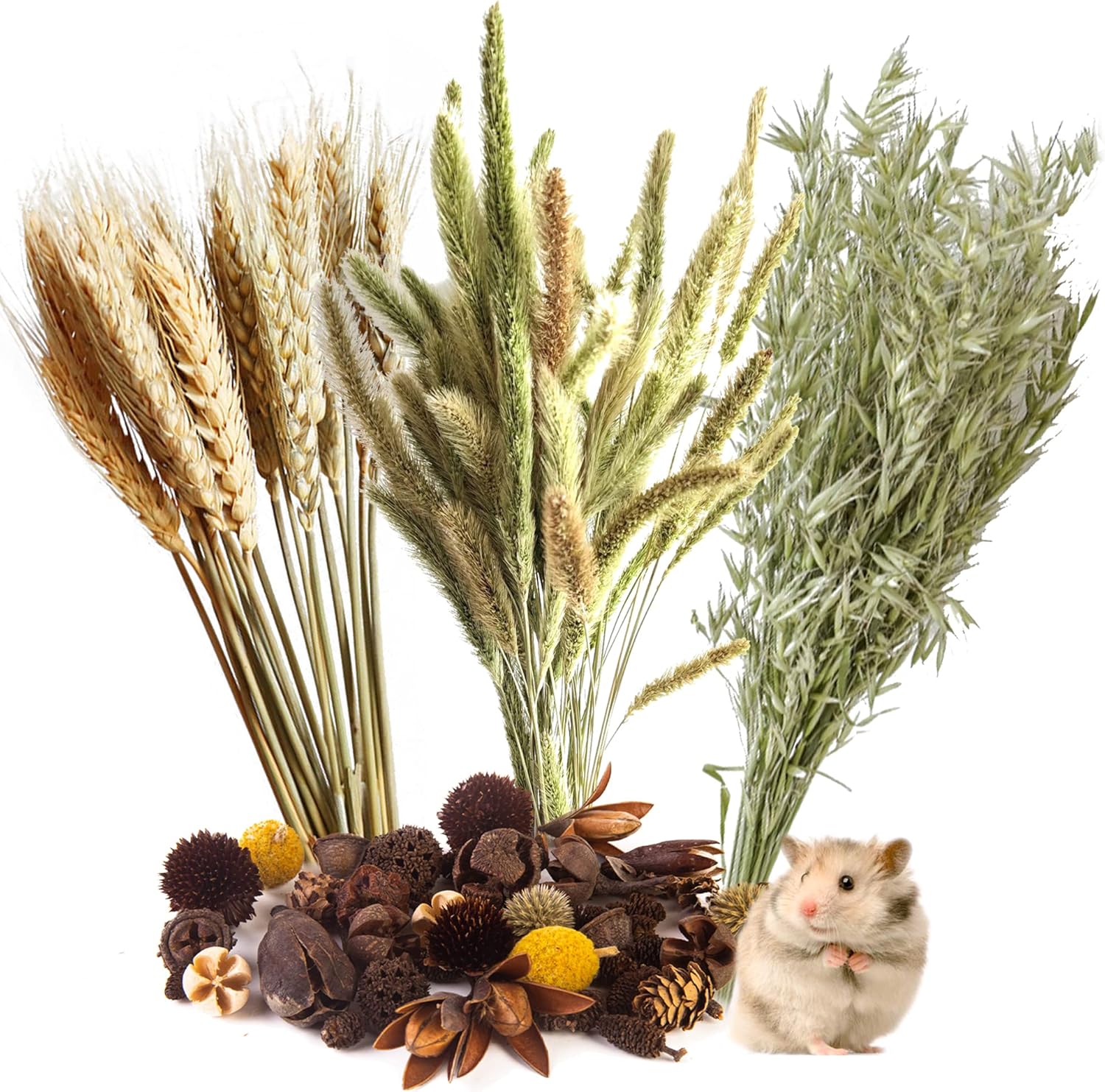 • What You Get: What you get: 1*box dry fruits , 15* oat, 20* ear of wheat and 50g foxtail. These grain ears not only redecorate the hamster's home, but also provide more hamster toys to enrich their experience.
