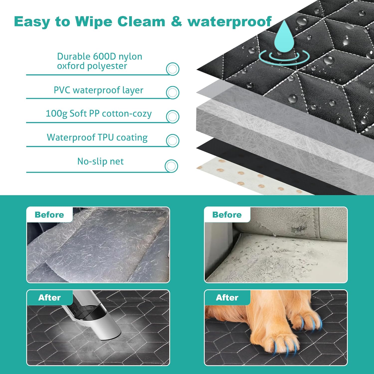 • PROTECT TRUCK INTERIOR: Our pet seat cover is made of 600D Oxford fabric, 100g PP cotton, 210D polyester fabric, and 100% waterproof TPU. The durable material prevents your dog from scratching the car seats. Installing the back seat pet cover for dogs can prevent pet hair from getting into the seat crevices while also protecting the car interior from pet urine damage