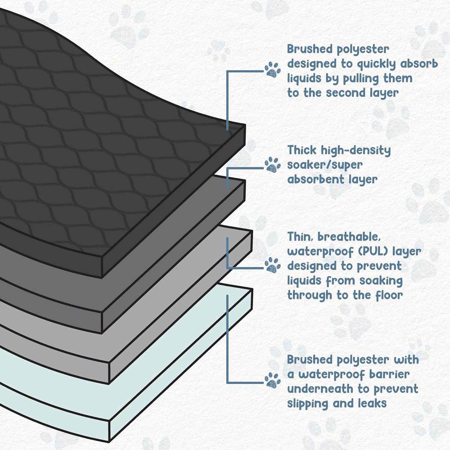 • HIGH-QUALITY PET PEE PADS: Our dog pads are crafted with durability in mind and are OEKO-TEX Standard 100 certified. They feature a highly absorbent, waterproof, and washable design. The slip-resistant silica paw prints on the bottom keep them securely in place on clean, hard surfaces, and the soft brushed polyester on the top ensures comfort during use.