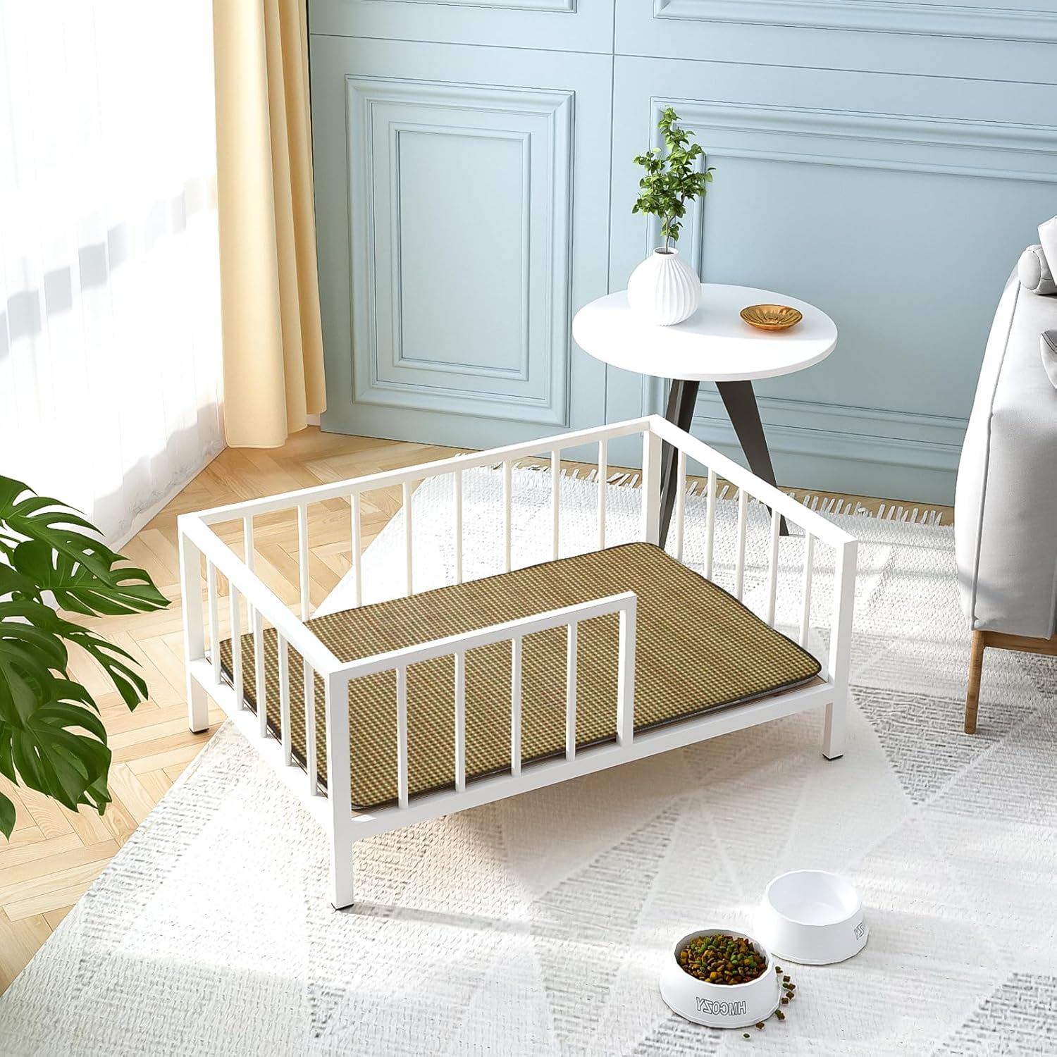 Dog Bed with Rails - Elevated Pet Metal Bed Frame with Solid Wood Board and Washable Soft Mat for Medium Dog Indoor or Outdoor Use, 25.2" x 37.8", White