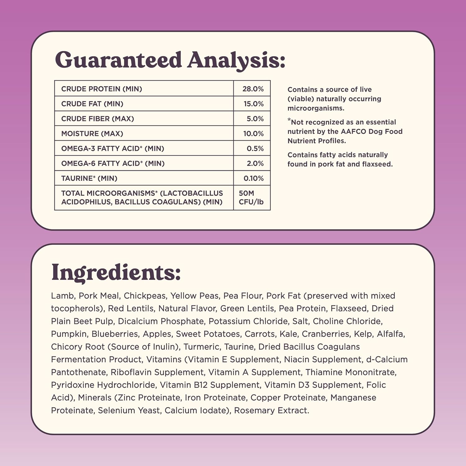 • GRAIN FREE DOG FOOD: Our wholesome lamb dog food recipe is grain free and chicken free with no corn, wheat, soy, artificial colors, flavors or preservatives. Great for dogs allergic to chicken.
