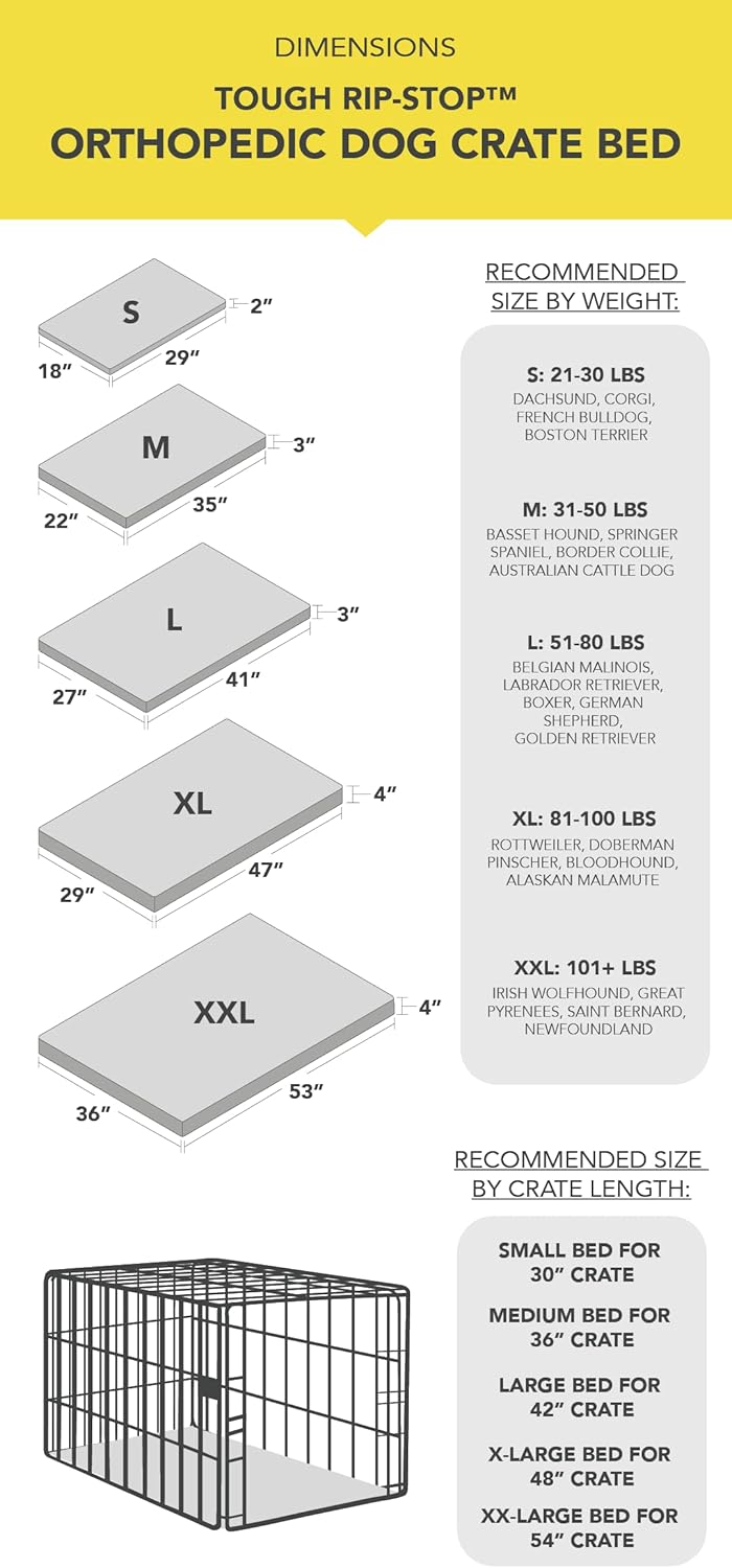 • Orthopedic Support: The solid foam mattress provides dense, firm support for your dog's joints, hips, and spine for optimal comfort in the crate. Unlike egg crate foam and other cheap, flimsy mattresses, our orthopedic crate beds don't lose support or flatten over time, even for the biggest and heaviest of breeds. Mattress thickness varies by bed size, ensuring the perfect balance between comfort and firmness for every dog breed.