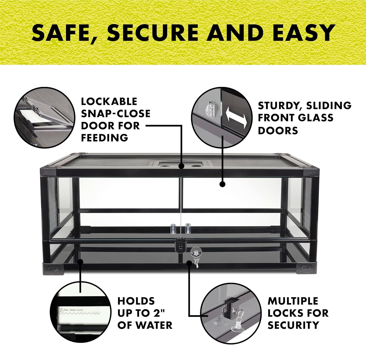 • Included Components : Terrarium, sliding front-opening doors, double hinged locking top screen, feeding port, water-holding base (optional), removable bedding tray (optional) Terrarium, sliding front-opening doors, double hinged locking top screen, feeding port, water-holding base (optional), rem… See more
