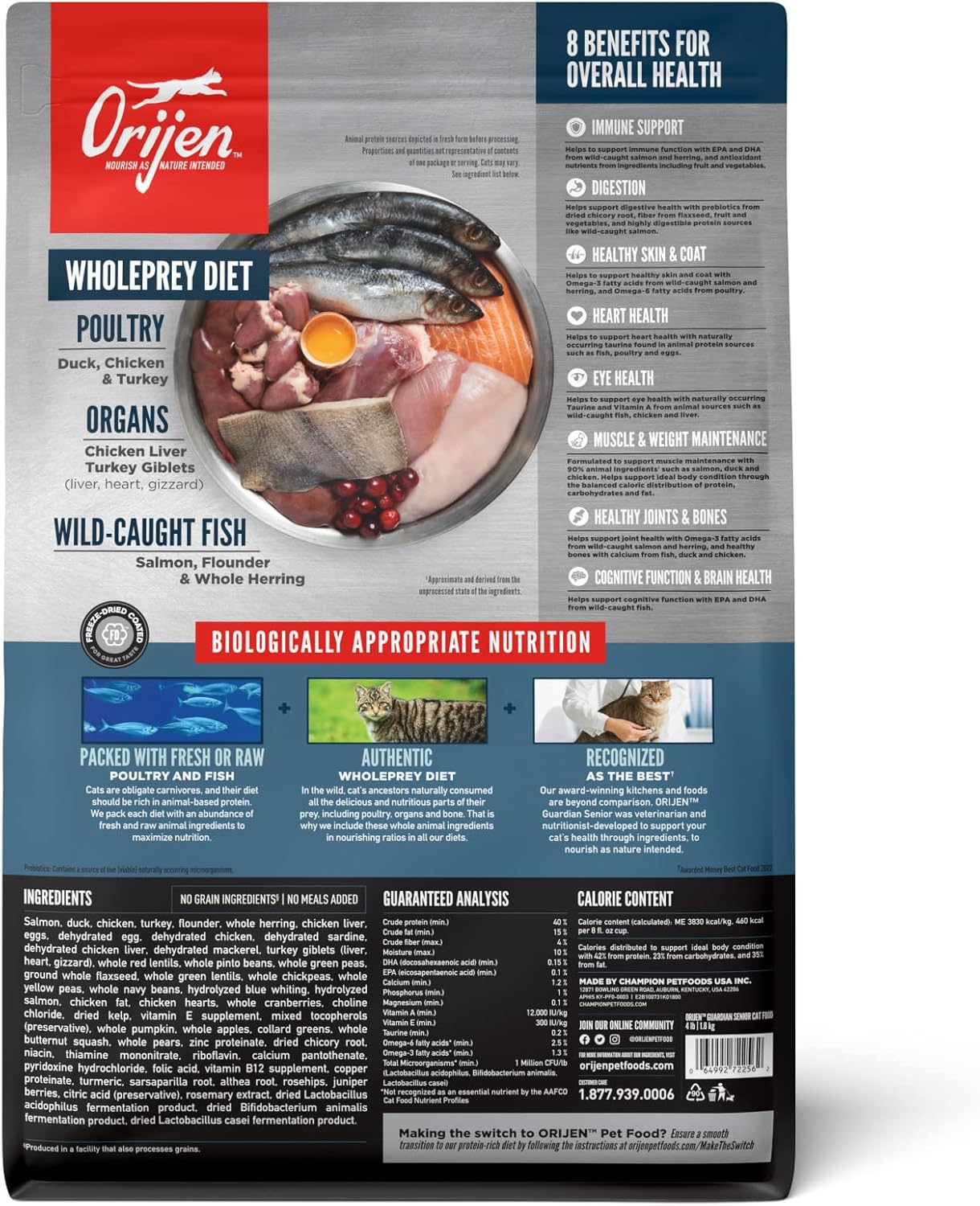 • ORIJEN senior cat food kibble is tailored to support your cat's unique needs as they grow older with eight key health benefits, helping support immune support, digestion and muscle and weight maintenance