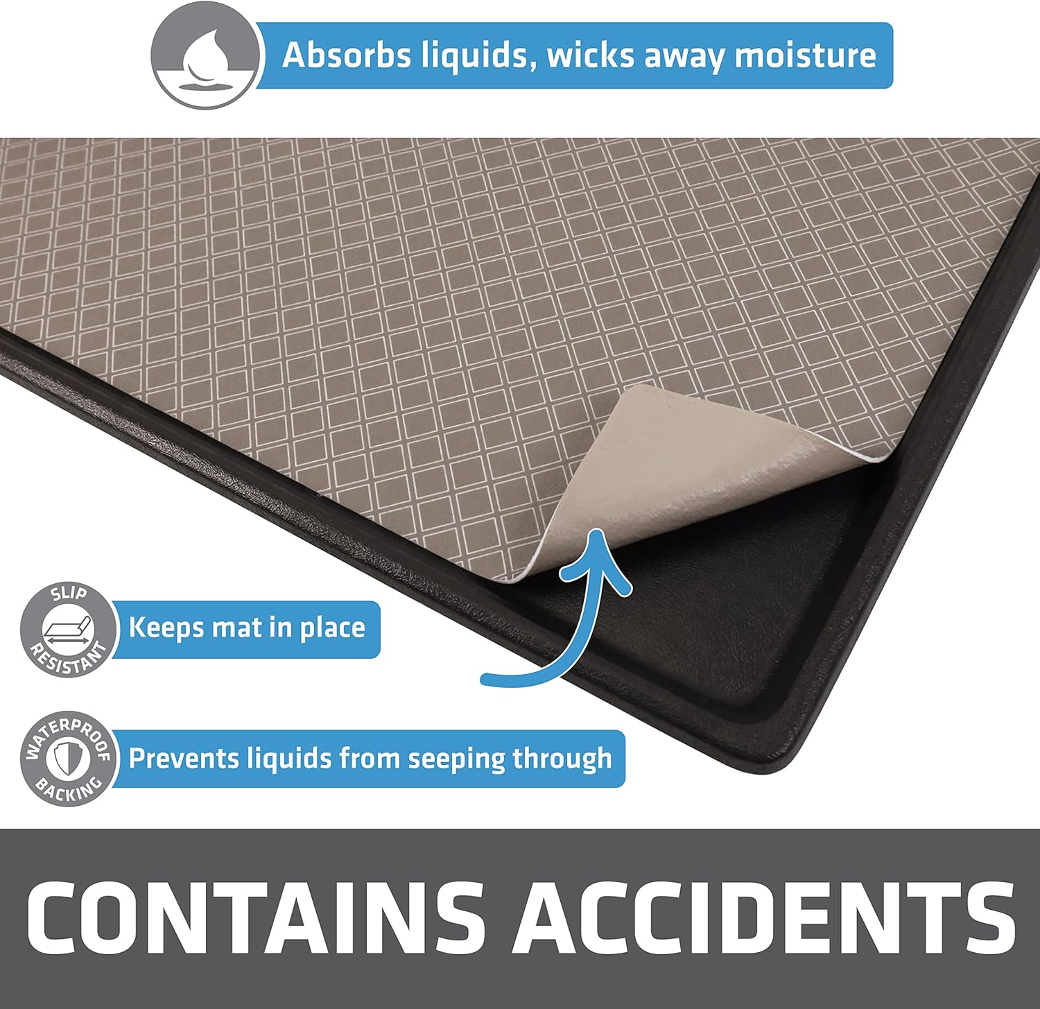 • ABSORBENT POLYESTER FABRIC, WITH WATERPROOF BACKING (SLIP-RESISTANT): Zorb-tech Anti Flow technology quickly absorbs liquids and wicks away moisture. Features a waterproof & slip-resistant backing that prevents liquids from soaking through to the surface below and keeps the mat securely in place.