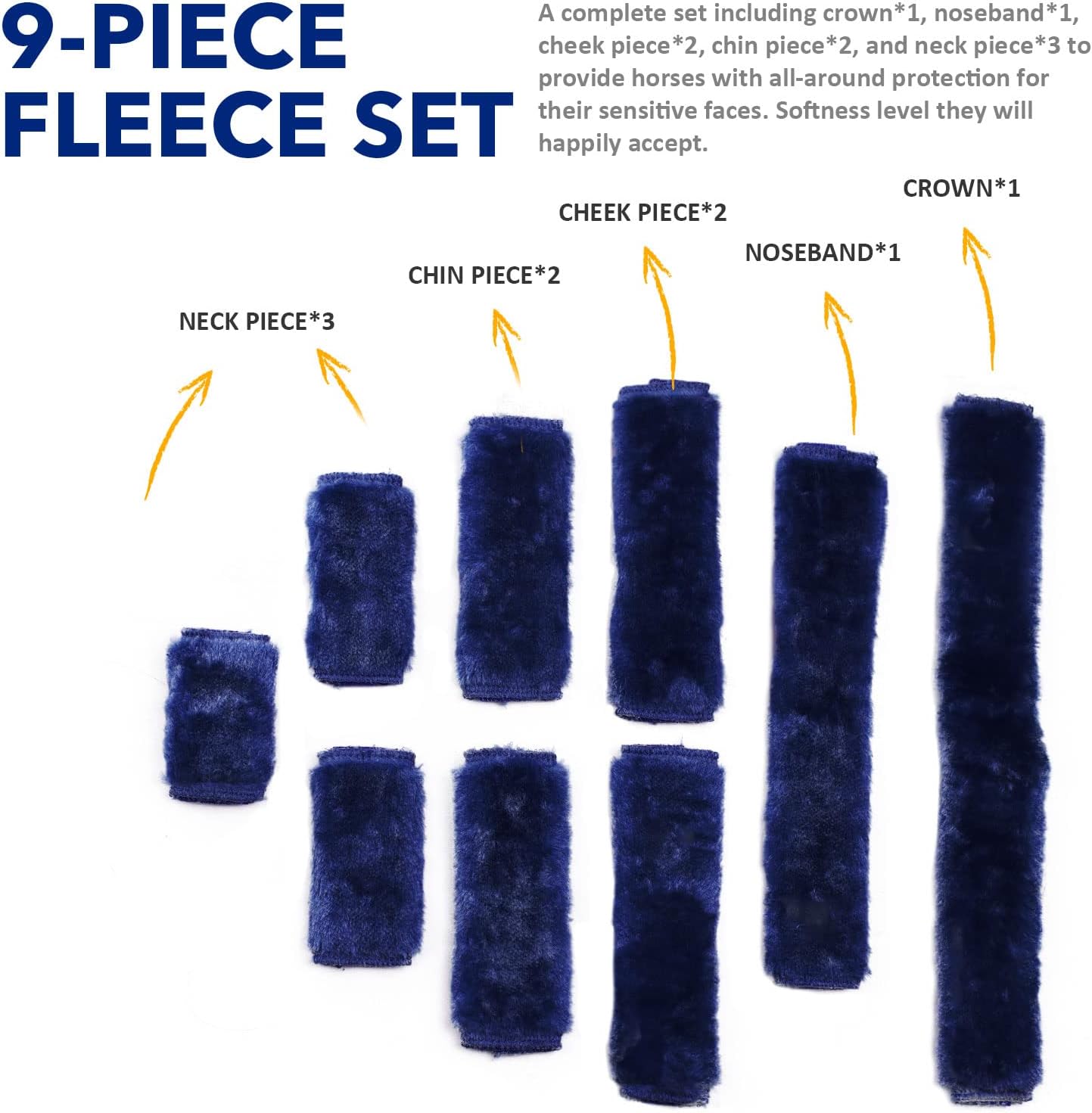 • 9-PIECE FLEECE SET: A complete set including crown*1, noseband*1, cheek piece*2, chin piece*2, and neck piece*3 to provide horses with all-around protection for their sensitive faces. Softness level they will happily accept. Equip your horse with this set and he is rub-free!