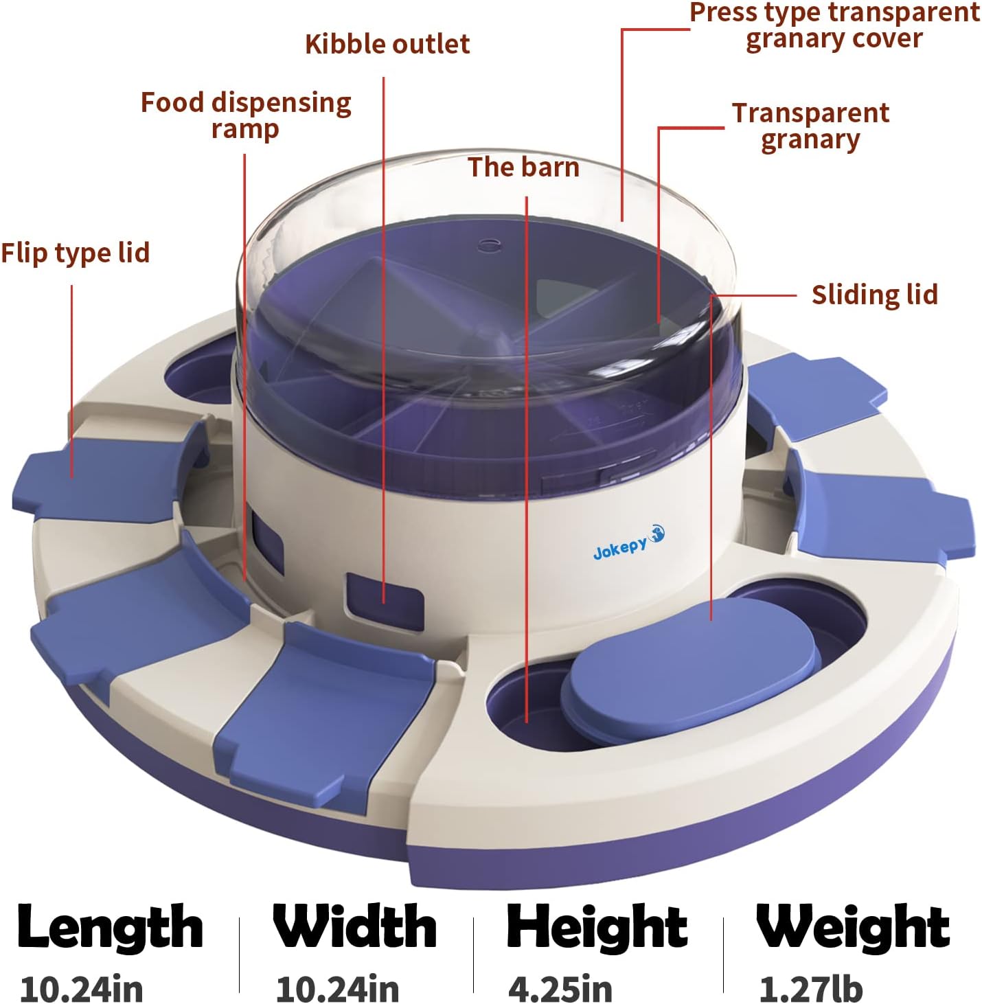 • 🐾【Easy to Use】Dog puzzle toys have 6 flip type lids, you can add food to the granary, pets press down on the transparent lid, food will fall into the leaky food-box. Pets also can eat food by moving 2 sliding lids.