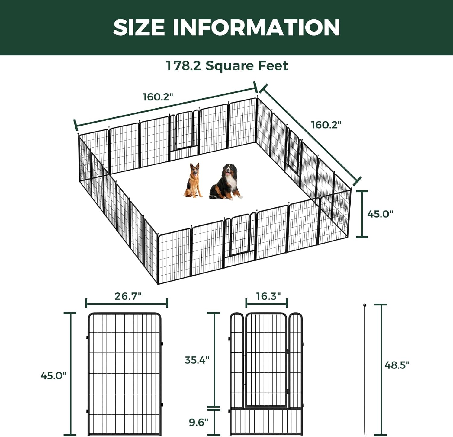 • Super easy to assemble: It won’t take you more than 5 minutes to assemble these portable dog fences as well as pack them away due to the rod-connected design. Meanwhile, panels can be added or removed freely to give you a fully flexible area and arrange the dog pen in any shape you need.