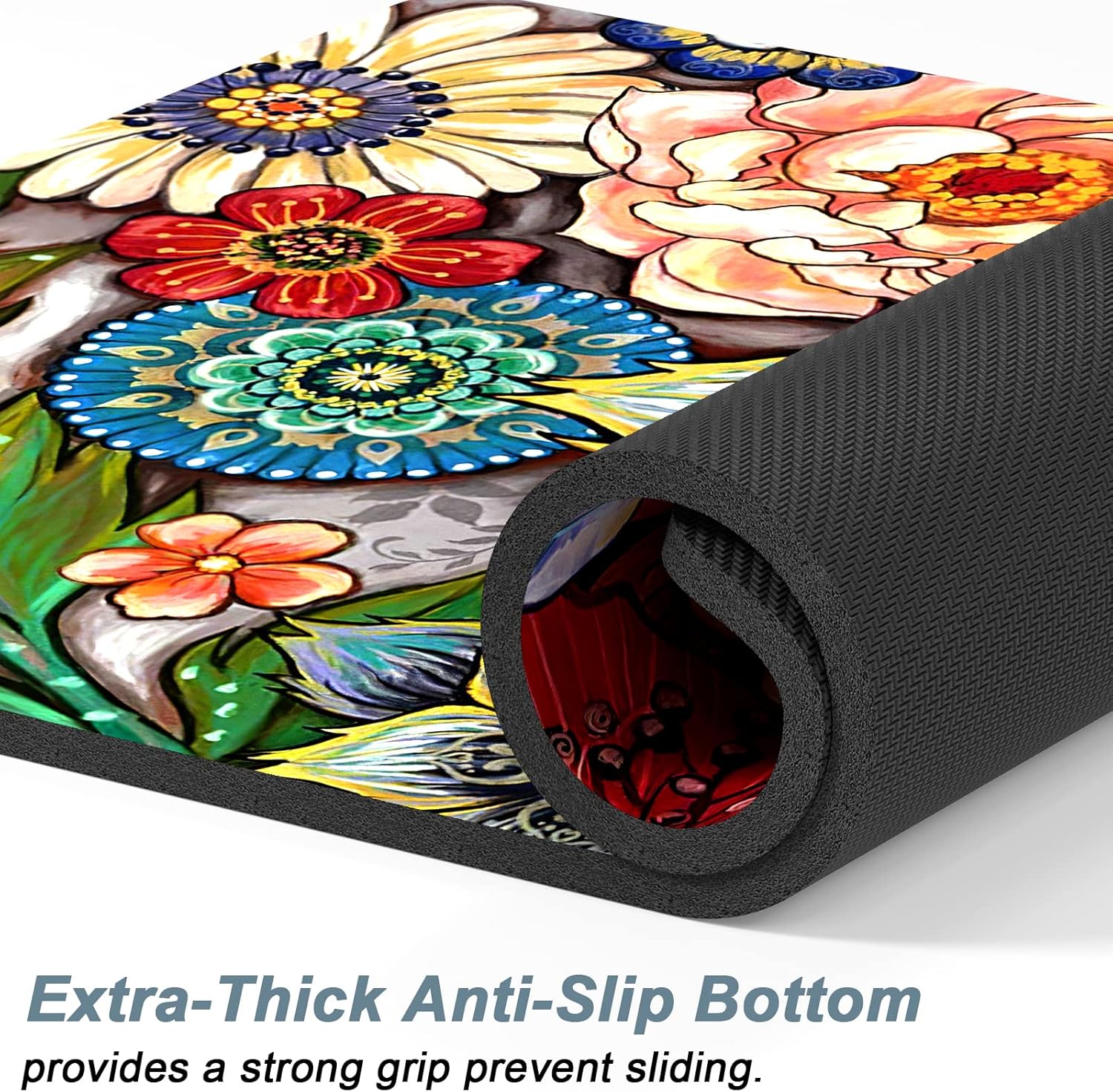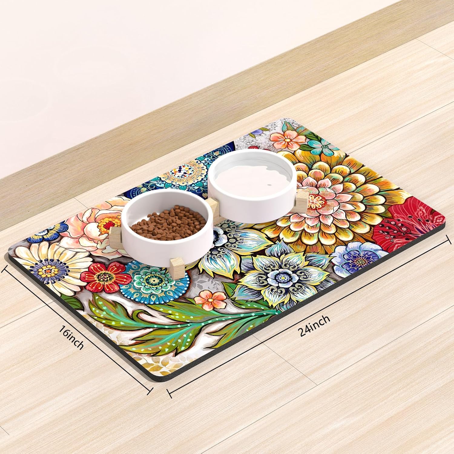 Rnivvi Dog Food Mat, 16" x 24" Flower Absorbent Dog Cat Bowl Mat for Food and Water, Cute Anti-Slip Rubber Pet Feeding Rug Protect Floors, Puppy Placemat for Feeding & Watering Supplies,Mandala Floral