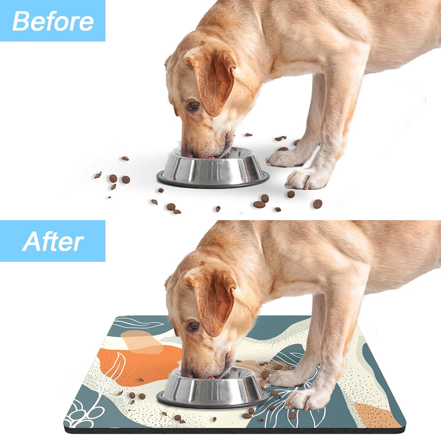 • Fashion Print Pet Mat: Pet feeding mat for floor with unique design, elegant yet simplistic, goes well with any style of home décor. Add this colorful pet food mat to your home to keep the floor clean and add a little touch of art to your lifestyle