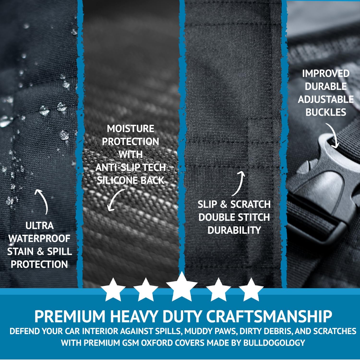 • HEAVY DUTY PROTECTOR: Defend your back seats against dog hair, muddy paws, dirty debris, and scratches. Bulldogology Dog proof Pet seat covers includes mesh window, zipper, full door side covers and extra thick layers for all-around protection. Regardless of what your pet may put it through, our dog car seat covers are crafted with double stitched quilted premium 600D GSM Oxford Material that Guarantees Lifetime Satisfaction.