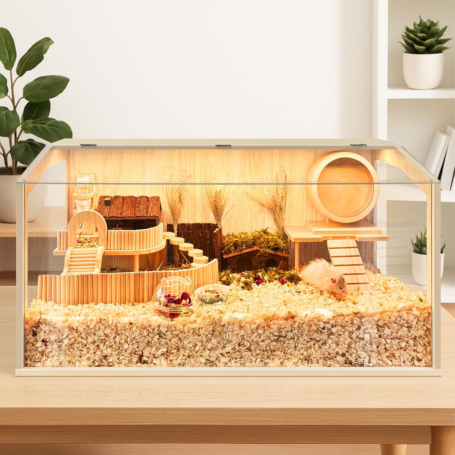 • 【Thick Bedding Matters】Research shows it’s best to have plenty of bedding so your hamsters can make a burrow just like they would in the wild. The extreme large interactive space of our cage is able to hold thick bedding and toy system for your pets to dig and explore. It's easy to arrange their hideout, sand bath area, hamster wheel, or exploring scene in the cage, which results in a far happier and less stressed hamster compare to the wire cage. We offer 4 different sizes, feel free to choose from 24-48in length. Note: The inner decoration is not included in the package