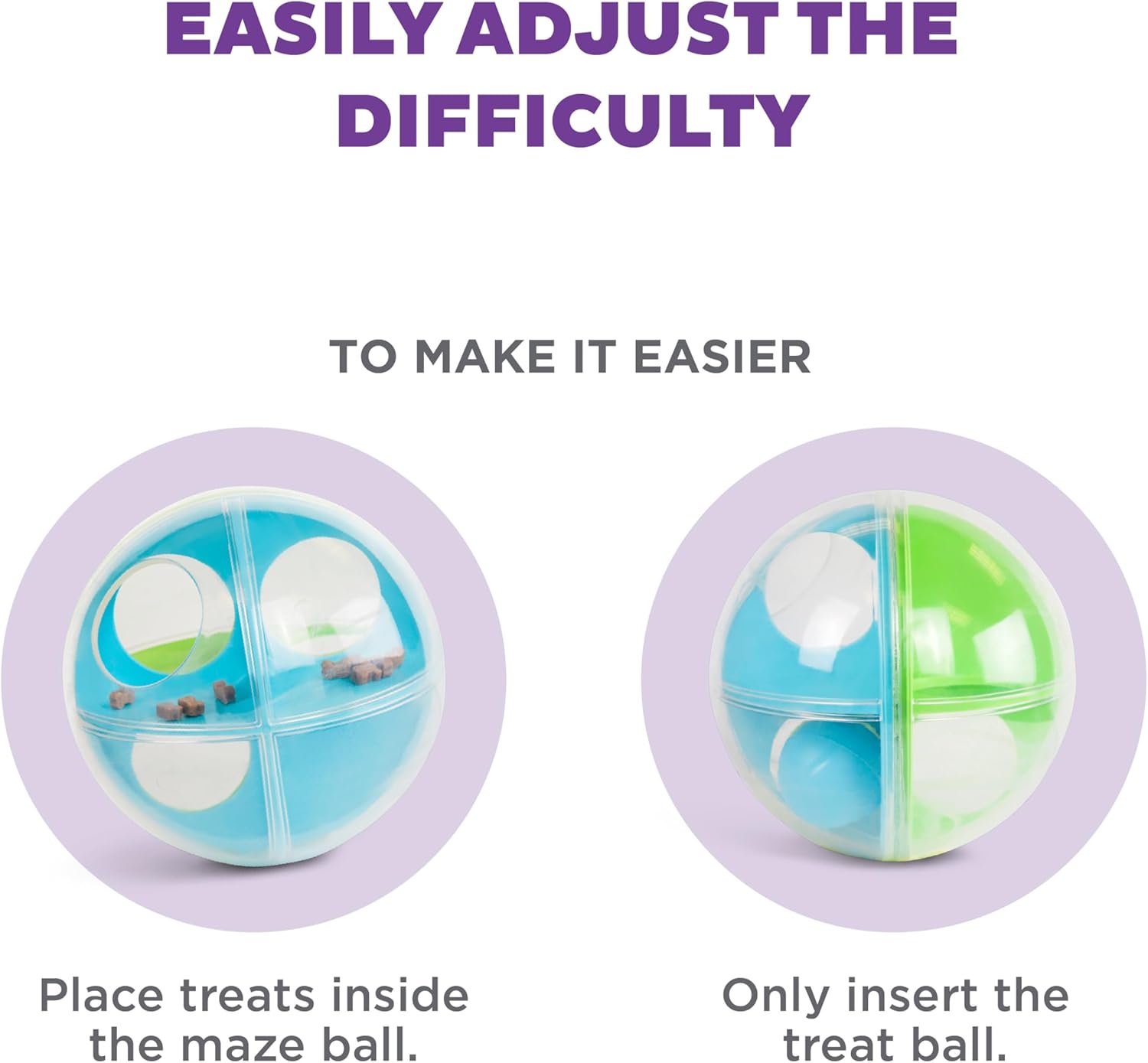 • Includes a tennis ball and a small treat ball – compatible with 2.5 in squeaky tennis balls so you can switch up the challenge and keep your dog guessing