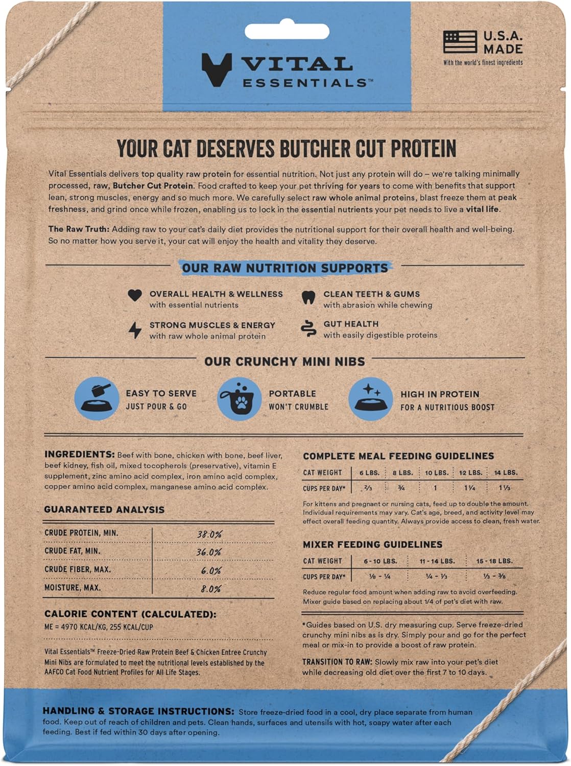 • CRUNCHY FREEZE-DRIED RAW BEEF & CHICKEN CAT FOOD: Vital Essentials Crunchy Freeze Dried Cat Food packs more protein than industry standard into every bite to deliver the peak vitality your cat deserves, especially when compared to dehydrated cat food. This complete and balanced freeze-dried raw cat food is made with premium butcher cut beef & chicken, responsibly sourced in the USA.