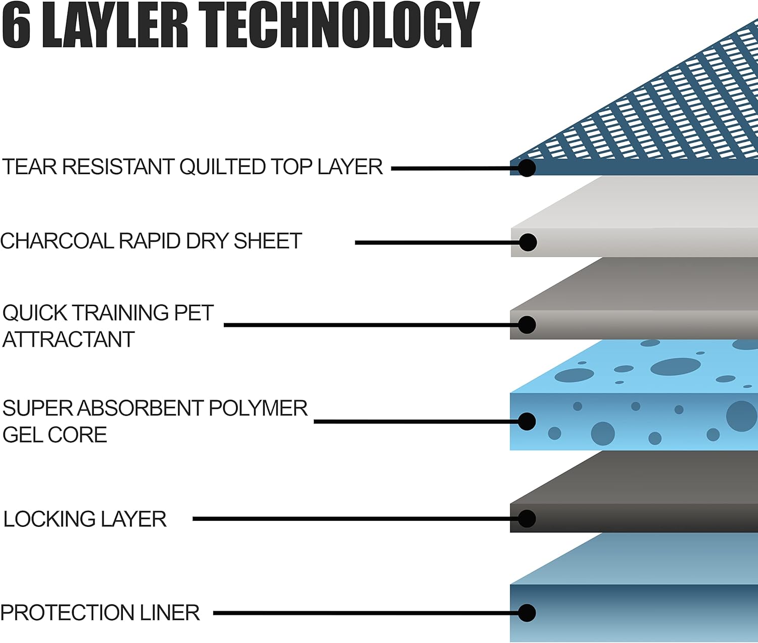• LEAK-PROOF 6-LAYER DESIGN WITH ACTIVATED CHARCOAL: These dog pads feature a charcoal rapid dry sheet that quickly locks in moisture and neutralizes odors. Combined with a waterproof liner, the multi-layer system prevents leaks and keeps your home clean and fresh.