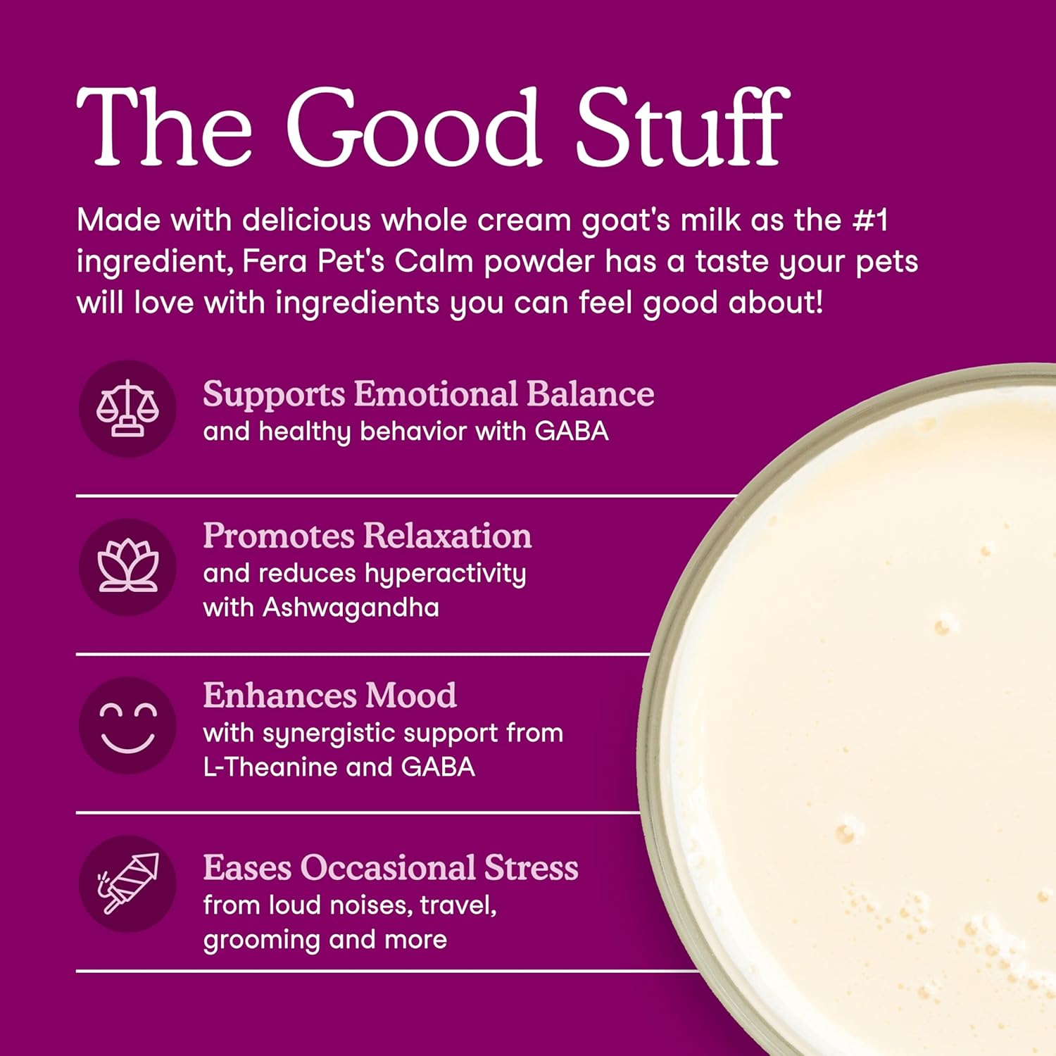 • Easy pet relaxation: Fera’s dog and cat Calming goat milk topper is a powerful mix of botanicals like ashwagandha, and neurotransmitters for an overall balanced mood