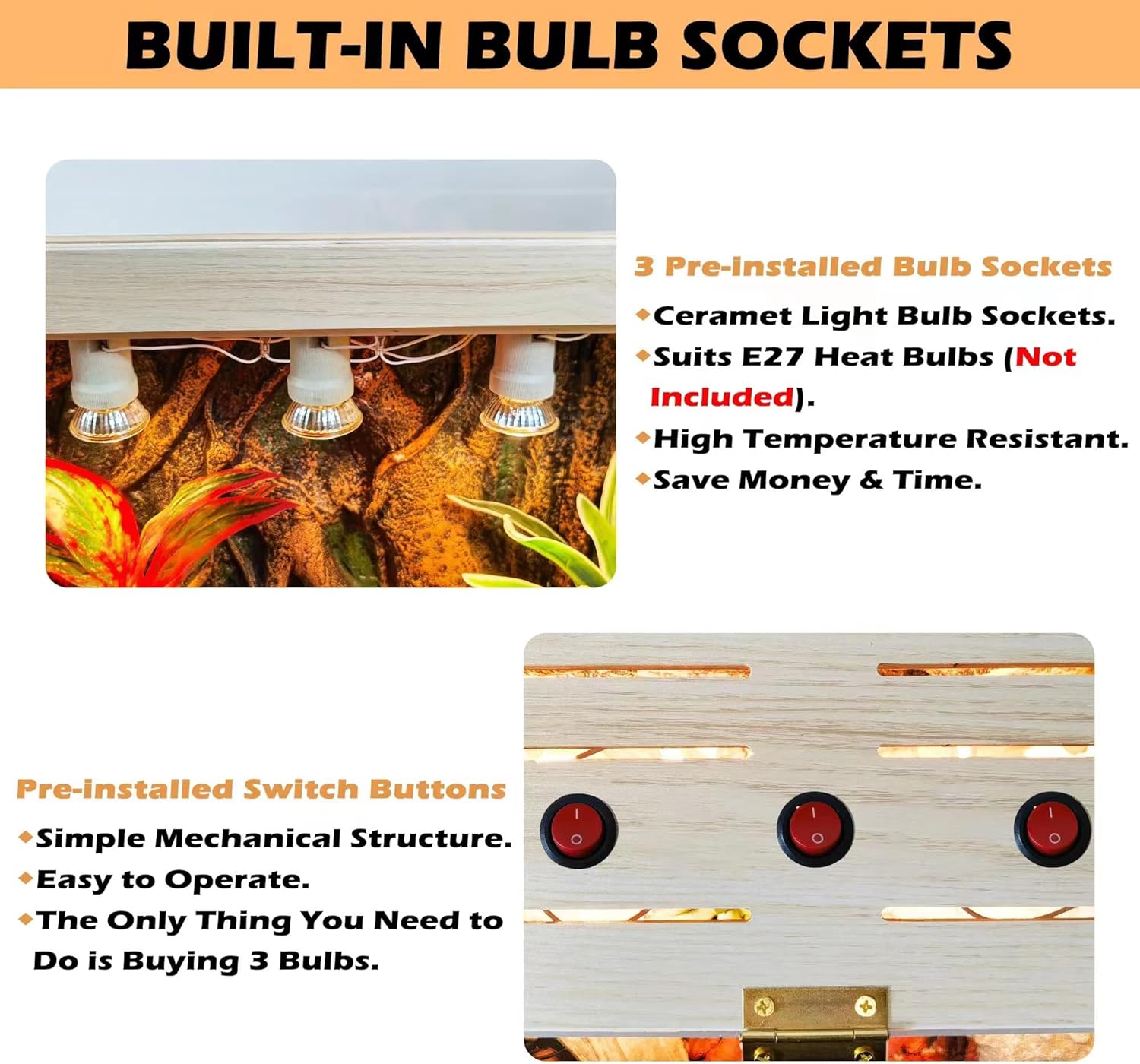 • 【Built-in Bulb Sockets】Featuring two built-in bulb sockets (three in the 40&48-inch version) compatible with E27 heat bulbs, night lights, and more (bulbs not included). Easily set up your lighting for the perfect reptile habitat.