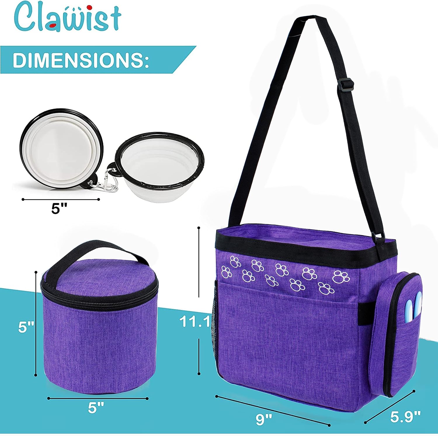 • DURABLE AND STYLISH - Clawist dog travel bag Made with premium materials, this travel organizer kit for pets holds all your pet essentials: dog food, treats, a water bottle, toys and other dog travel accessories.Built-in D rings for hooking your water bowl and dog leash.