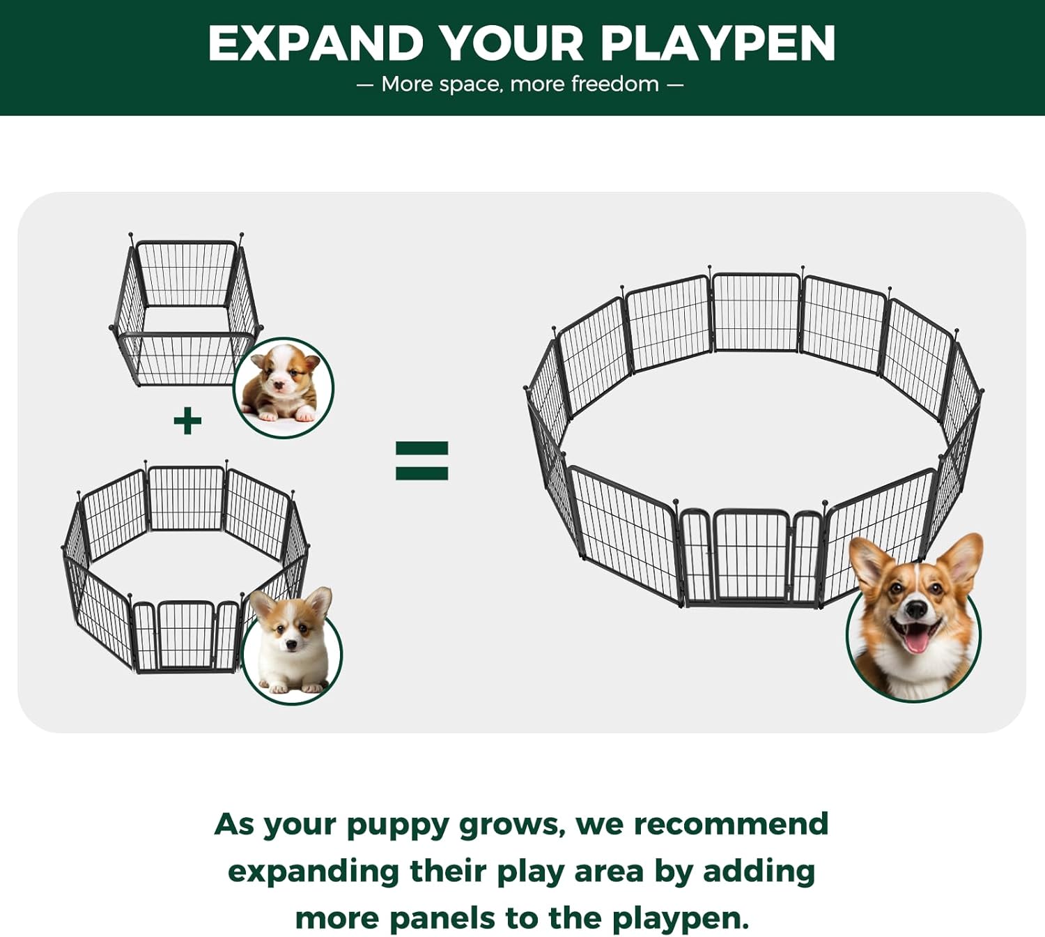 • Super easy to assemble: It won’t take you more than 5 minutes to assemble these portable dog fences as well as pack them away due to the rod-connected design. Meanwhile, panels can be added or removed freely to give you a fully flexible area and arrange the dog pen in any shape you need.