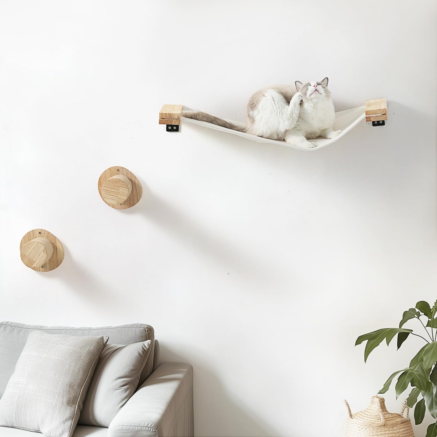 • Stable Support - FUKUMARU cat shelf set is made of solid rubber wood, safe and stable. The cat hammock and cat wall steps can easily hold cats weigh up to 30lbs, giving cats solid support.