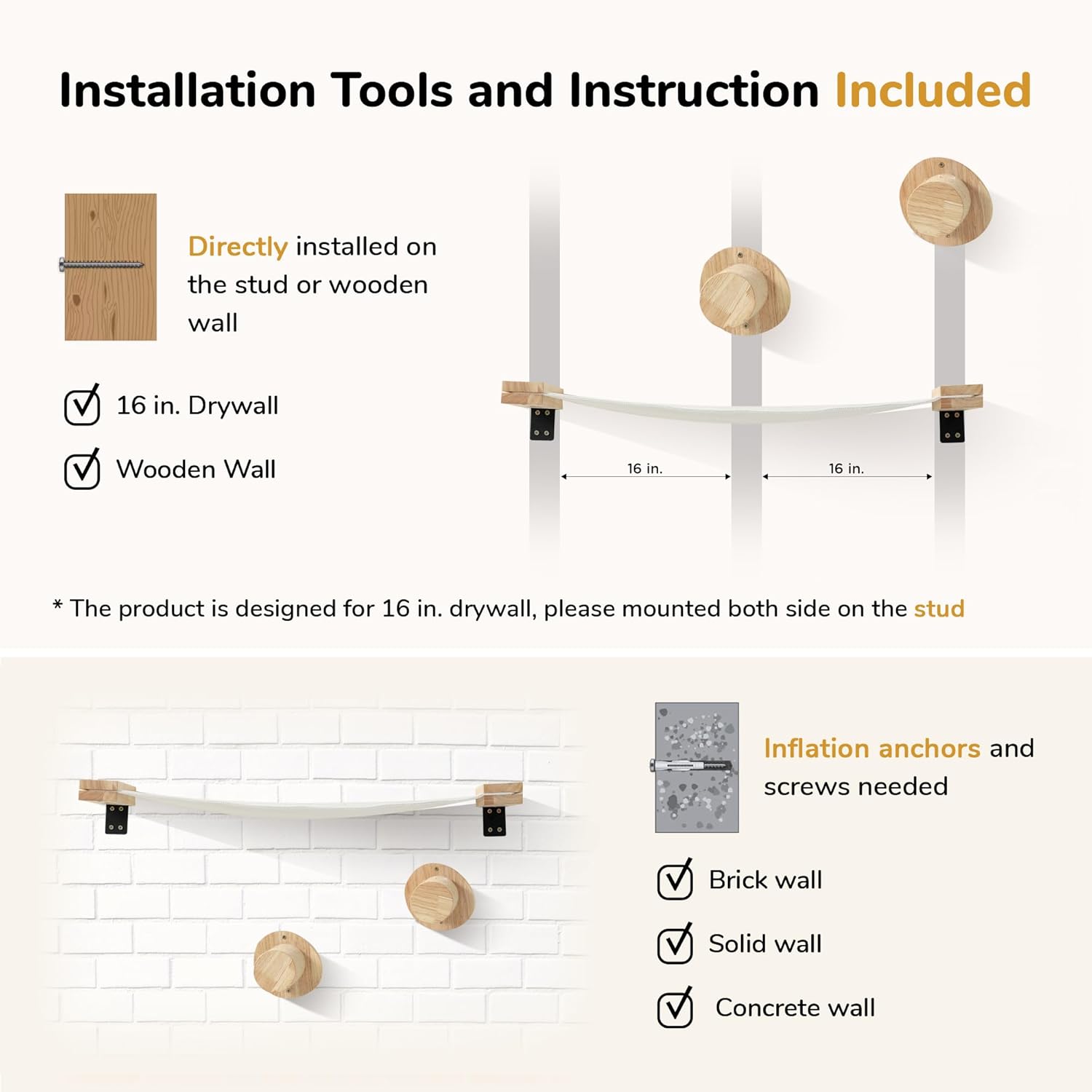 • Premium Design - For most family, drywall is supported behind by 16 in spacing wood stud, the cat perch and wall ladders are designed to ensure at least one side can be installed on the stud, maximum stability.