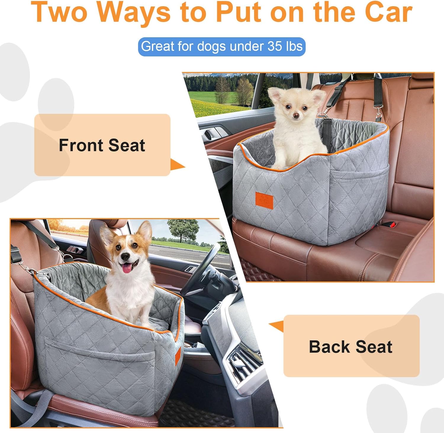 • Comfortable and Secure: The pet car seat is made of high-quality breathable fabric with a super soft plush rim, providing plenty of room for small dogs to readjust and get comfortable. The firm foam construction maintains its shape, offering a soft and cozy place for your dog to relax in extreme comfort. The non-slip bottom and safety tethers ensure that both your dog and the seat stay securely in place, preventing any sliding around while driving.