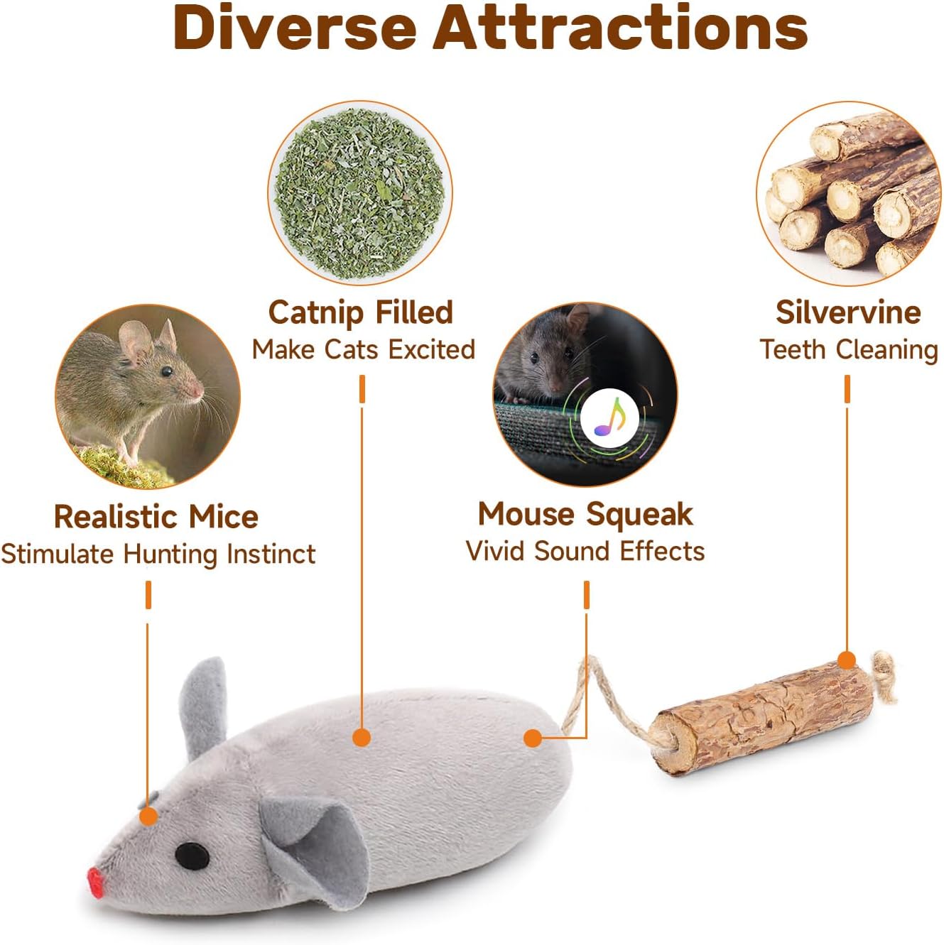 • Squeak Mice – Make play fantastic with the 3 plush squeaking mice toys. The cat toys make lifelike mouse chirping sounds once playtime begins, beckoning every bat, bite, chew, and chase! The mice kitten toys keep quiet when left alone to save battery power