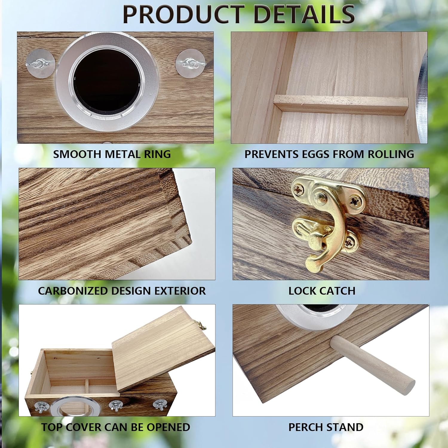 • 【Carbonized Appearance】 Our parrot breeding box is made of natural solid wood, safe, non-toxic, sturdy, and durable, providing a bird-friendly environment. The surface of the bird's nest is carbonized, enhancing the natural texture and creating a primitive effect, allowing pet birds to feel a sense of returning to nature.
