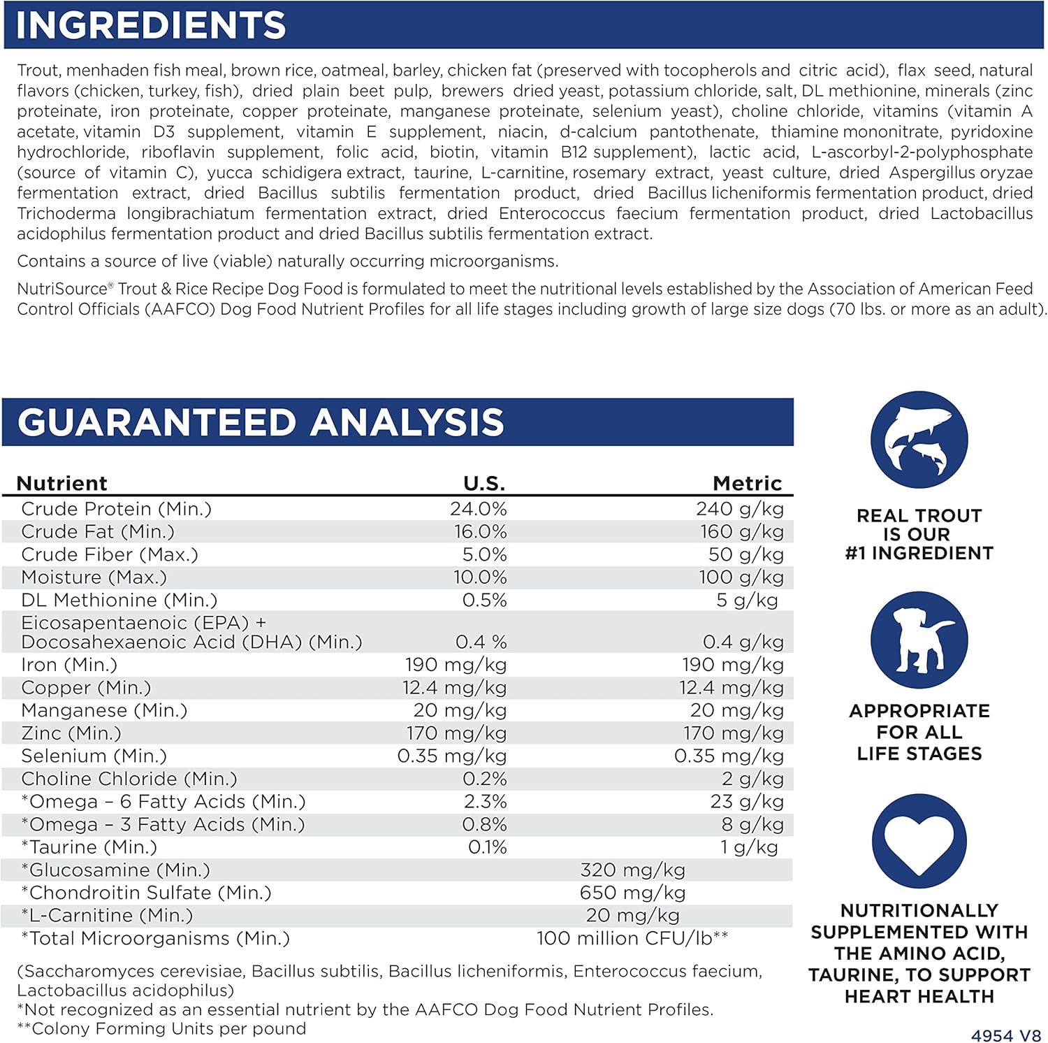 • As a member of our grain inclusive series, NutriSource Trout and Rice Dry Dog Food is formulated to meet AAFCO guidelines for all lifestages