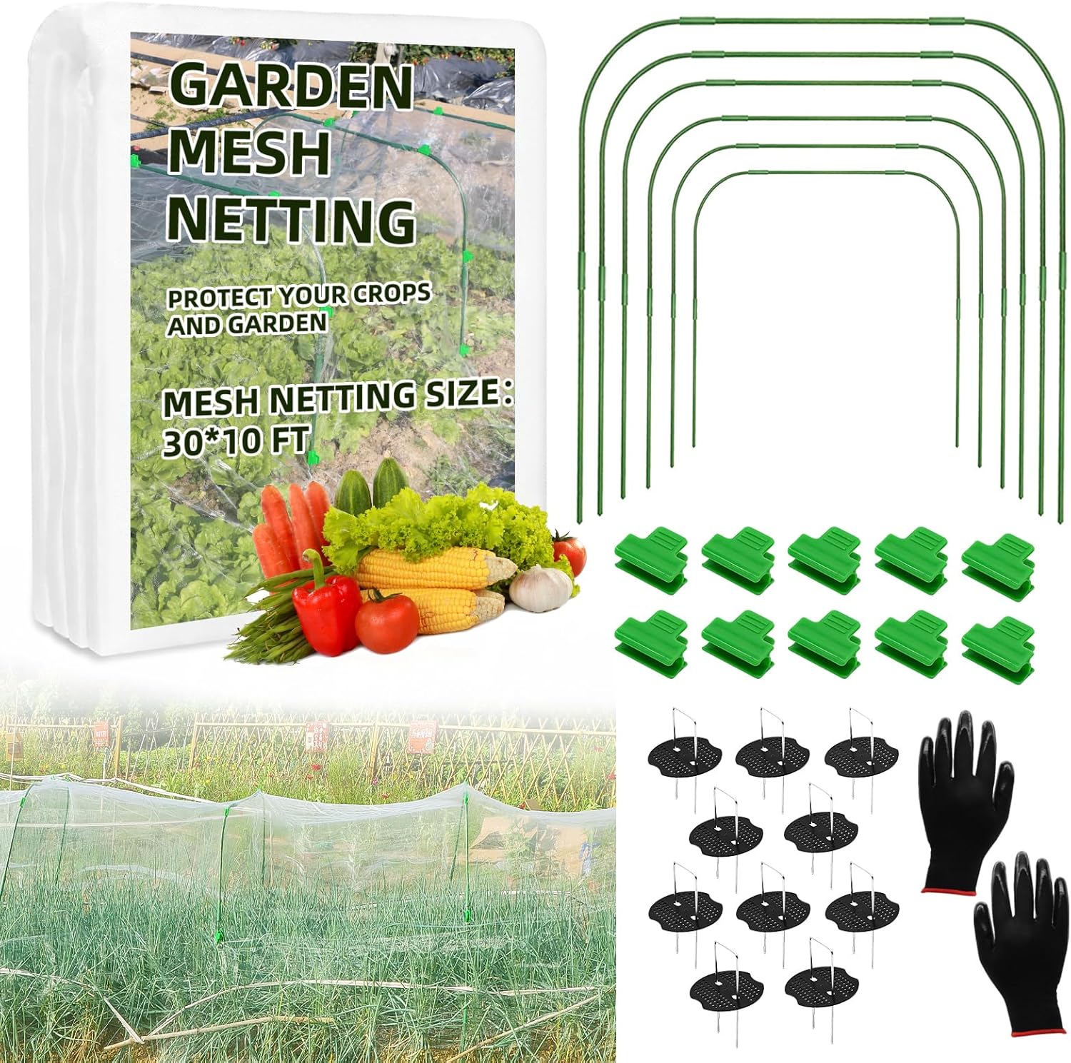 • [Thickened and Upgraded Garden Netting Kit ] Includes 10x30ft Ultra Fine Mesh Garden Netting, 36 Clips, 1 Pair of Gloves, 10 Sets of Ground Spikes and 6 Garden Hoop Kits. The garden netting has been thickened from 30g / 60-mesh to 32g / 60-mesh for improved filtration.