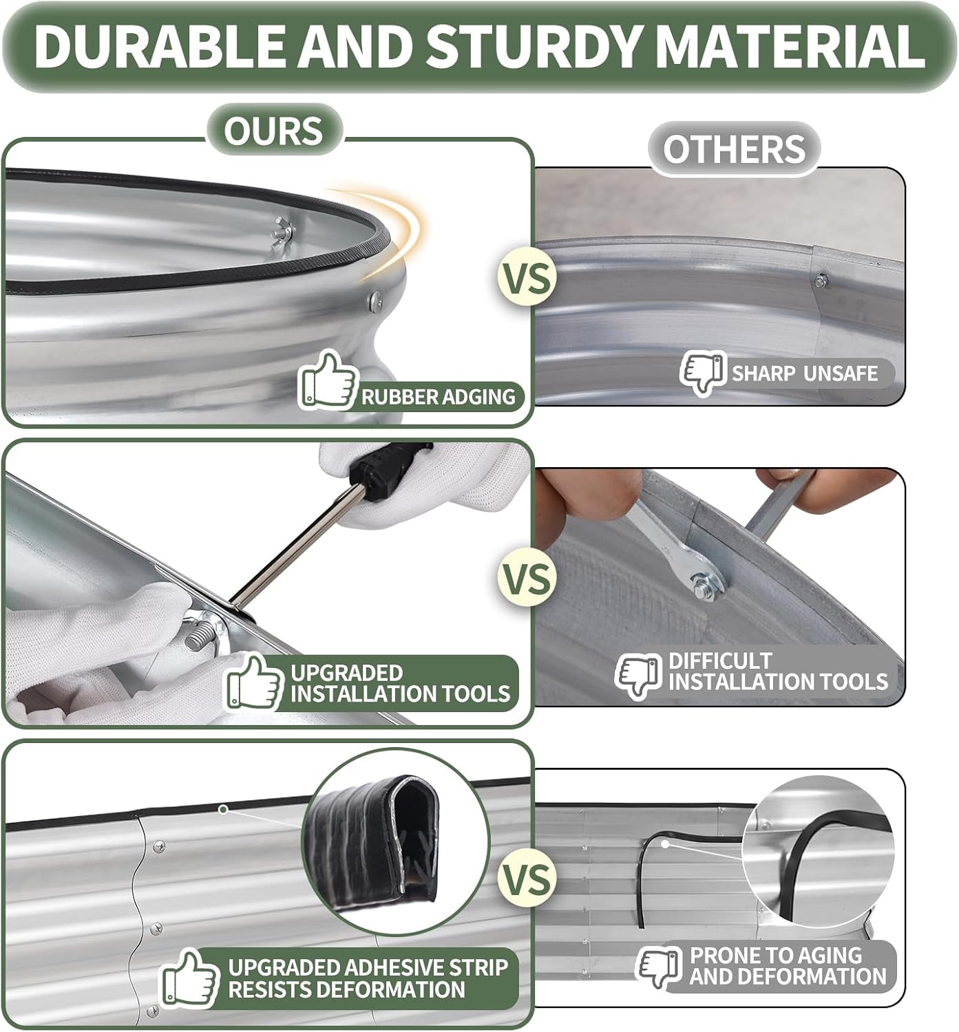 • 【High-quality materials & Durable】 Our outdoor raised garden bed is made of 0.5mm galvanized metal sheet, with double-layer anti-corrosion galvanization and an oval-shaped design. It is resistant to corrosion and rust, providing a long-lasting gardening solution that can be reused for many years.