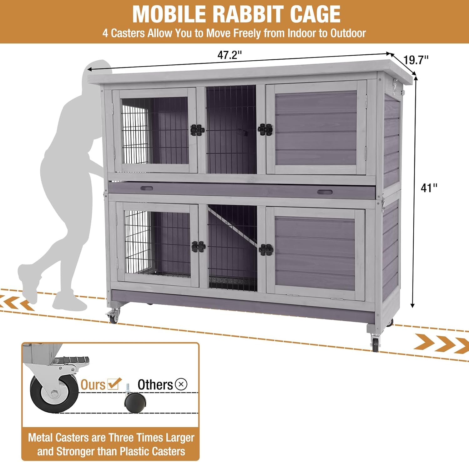 • Four Casters: Move the hutch around your yard or home with casters, allowing your rabbits to enjoy different environments and ensuring easy cleaning