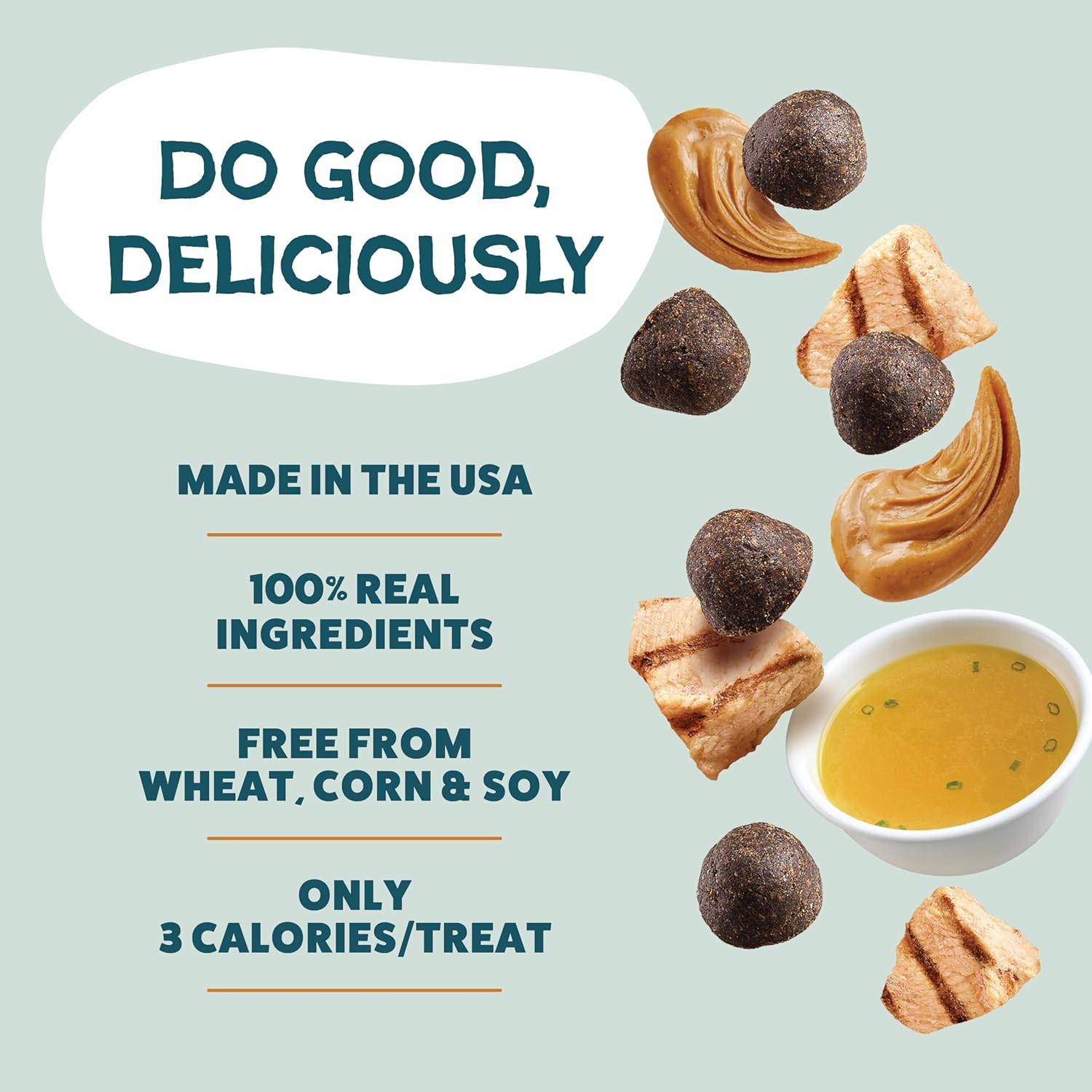 • Whole Ingredients: These high-reward treats are free from corn and soy while loaded with wholesome ingredients like real peanut butter, chicken, and chicken bone broth. At only 3 cal/treat, these are the perfect medium training rewards for your pup throughout the day. Dogs of all ages, sizes, and breeds can enjoy these firm and chewy treats!