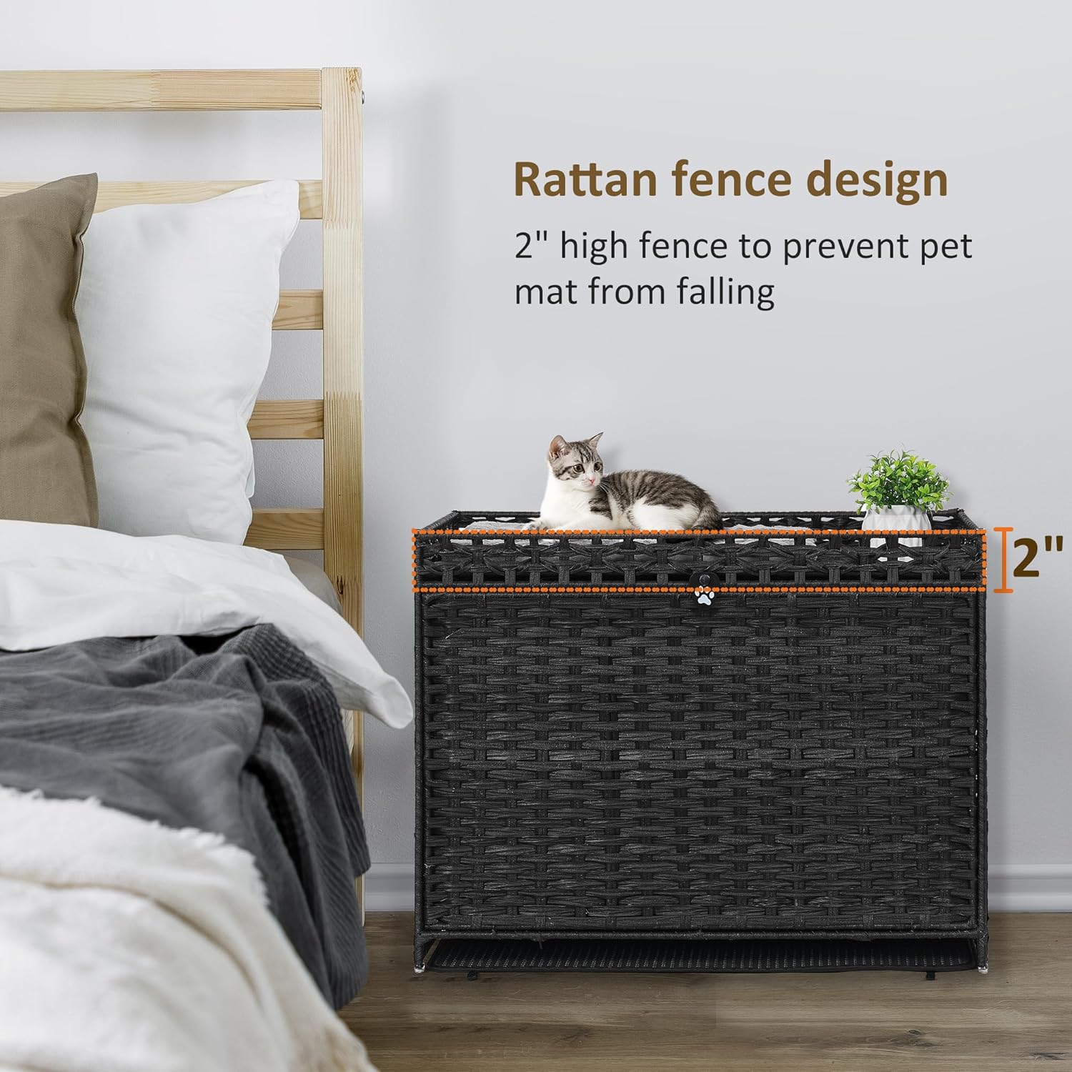 Cat Litter Box Enclosure with Soft Litter Mat; Hidden Cat Washroom Furniture with Door; Handwoven Rattan Cat House with Large Space; Pet Crate for Living Room, Bedroom, Balcony (Black)