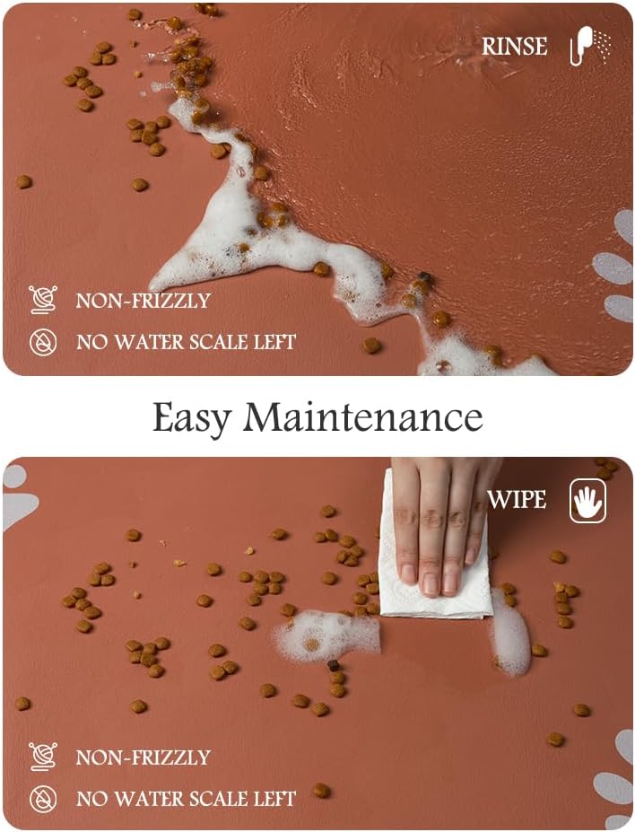 • Keep Clean & No Stains:No marks will be left when food and water are dropped on the dog food mat. Unlike traditional silicone pet feeding mats, our pet feeding mat for food and water won't pick up pet hair or dust, and won't build up tough-to-clean limescale, keeping the dog bowl mat as good as new forever.