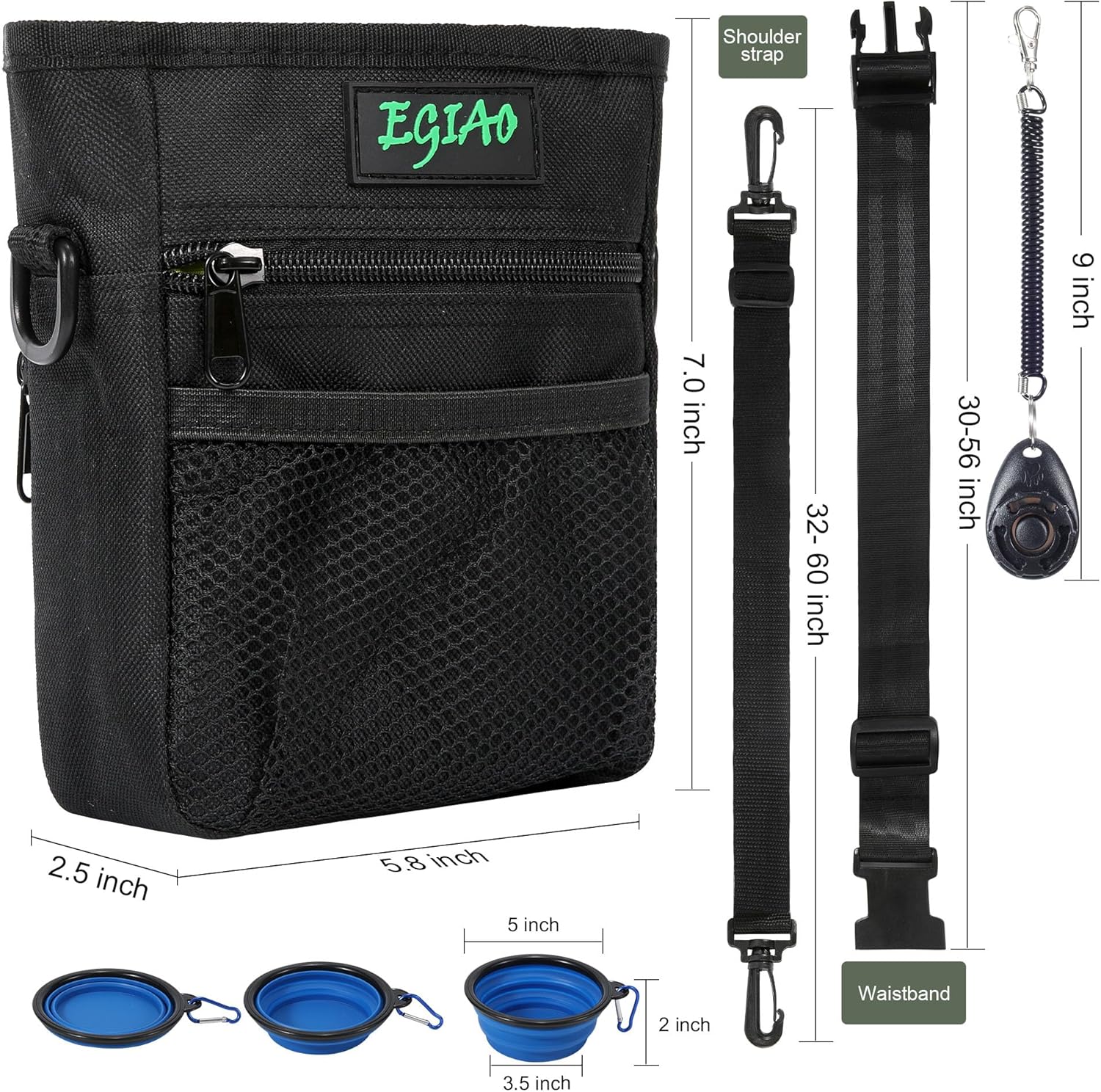 • 🐾6PCS Dog Training Kit: Includes 1 multifunctional dog training pouch, 1 collapsible dog bowl, 1 training clicker, 1 Roll of Poop Bags, 1 waist strap, 1 shoulder strap