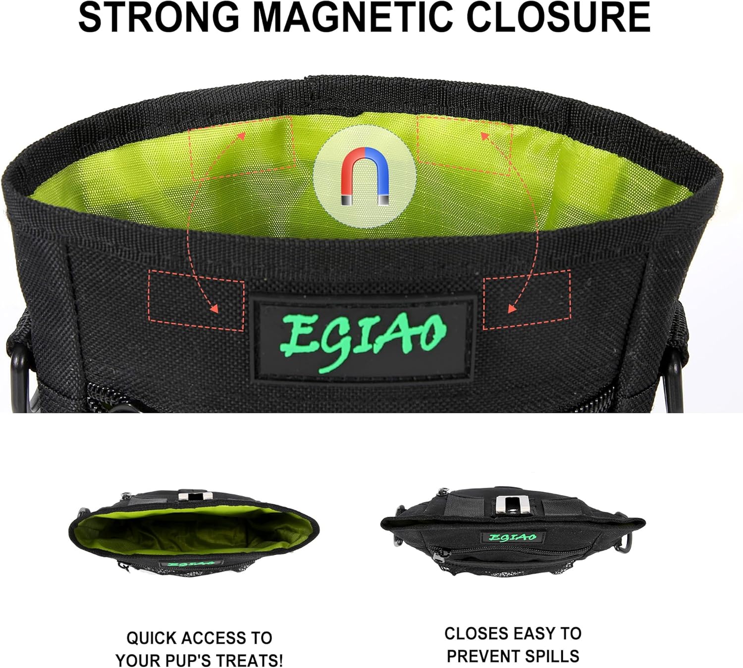• 🐾Unique and Reasonable Design: Our dog treat pouch has a convenient magnetic closure design, which can be easily opened and closed by one-handed operation. When closed, the items in the dog food bag will not fall regardless of bending, running, etc. And dog treat bag fits your waist perfectly, helping you to reduce fatigue when interacting with the dog for a long time, and can meet all your training needs.