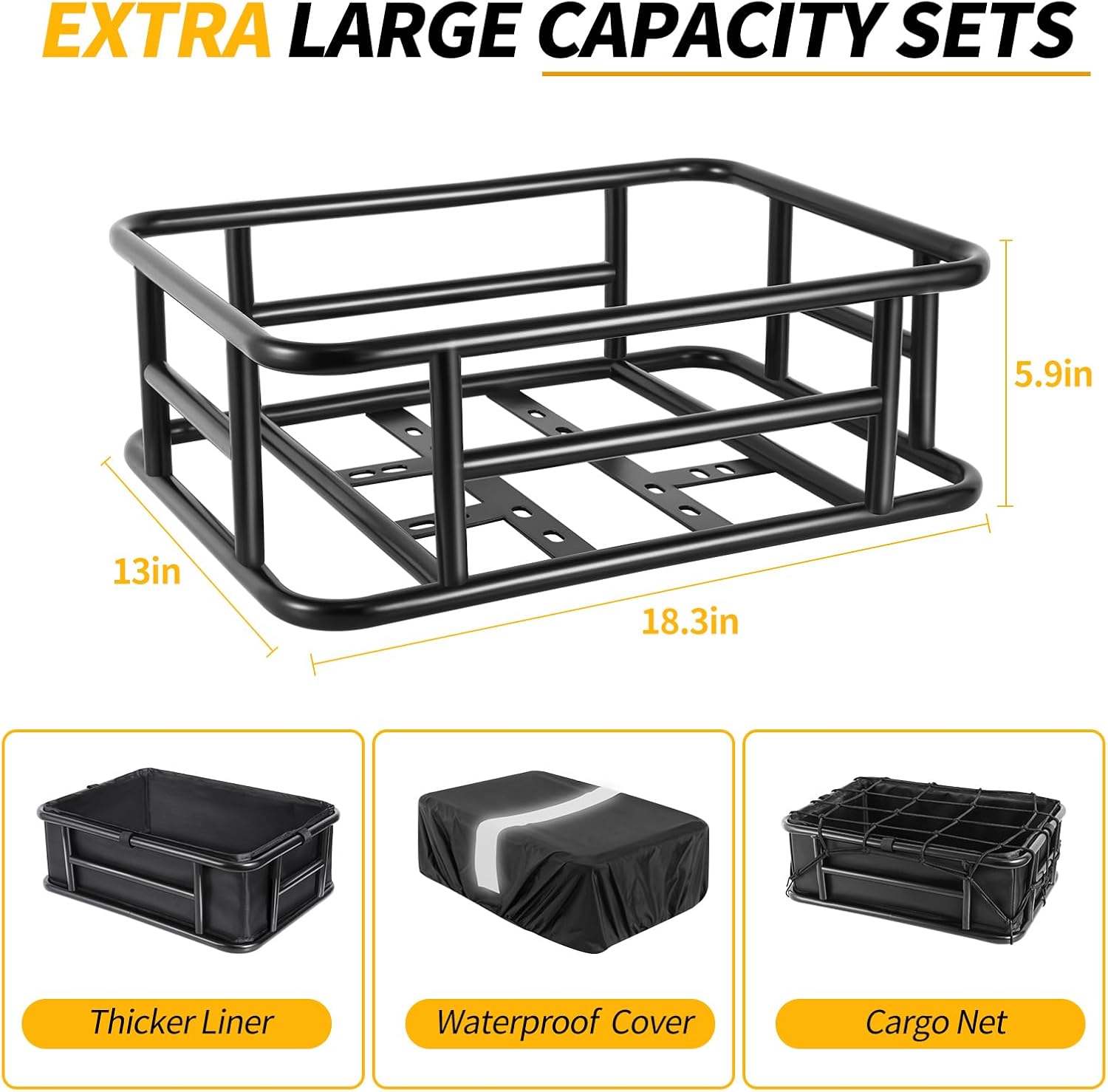 • HEAVY LOADING CAPACITY:Our rear bike basket are the most loaded basket on the market!Thanks to the high quality material,Our bike basket can be loaded over 100 lbs.It adds a lot space when you're going on a bike trip or to the store for carrying groceries